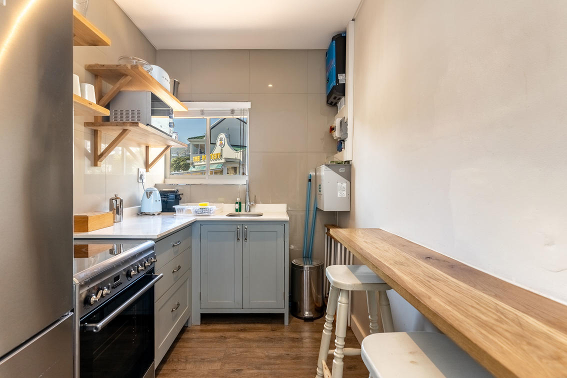 Cuisine entièrement équipée avec salon décloisonné et chambre avec salle de bains privative donnant sur une terrasse offrant une vue sur la plage. L'appartement est situé à 20 mètres de la promenade et de la plage de Camps Bay.