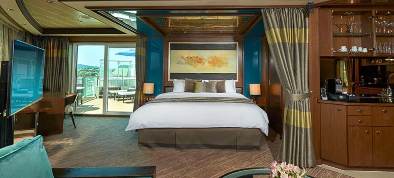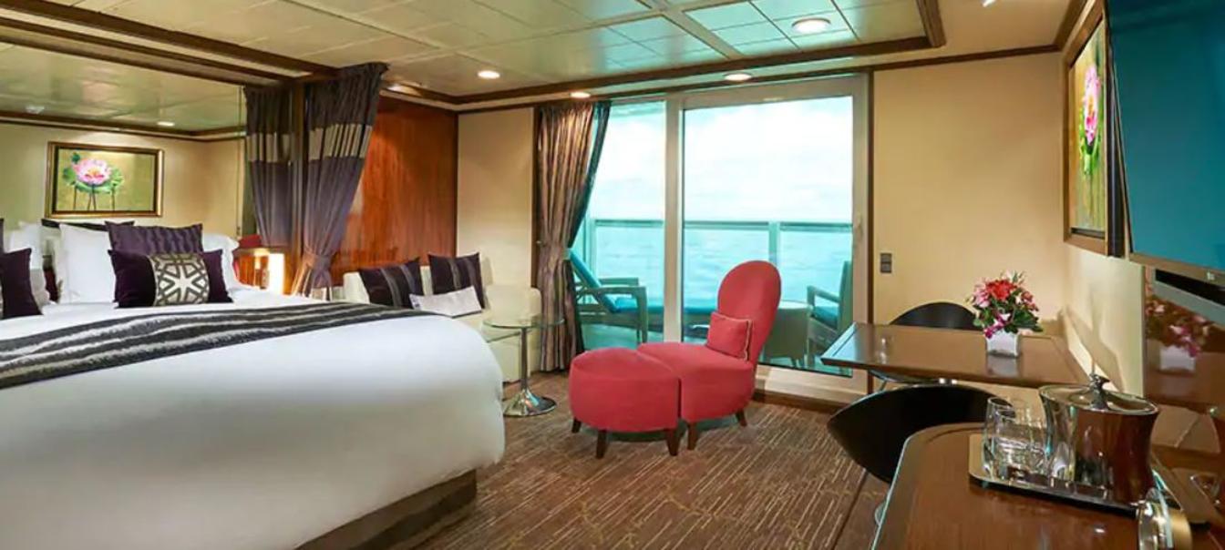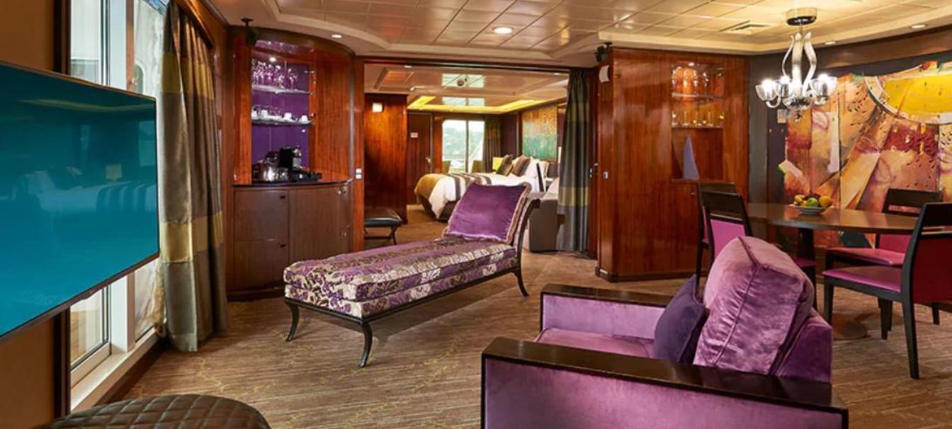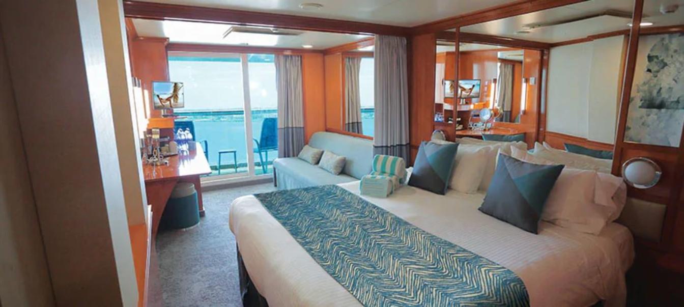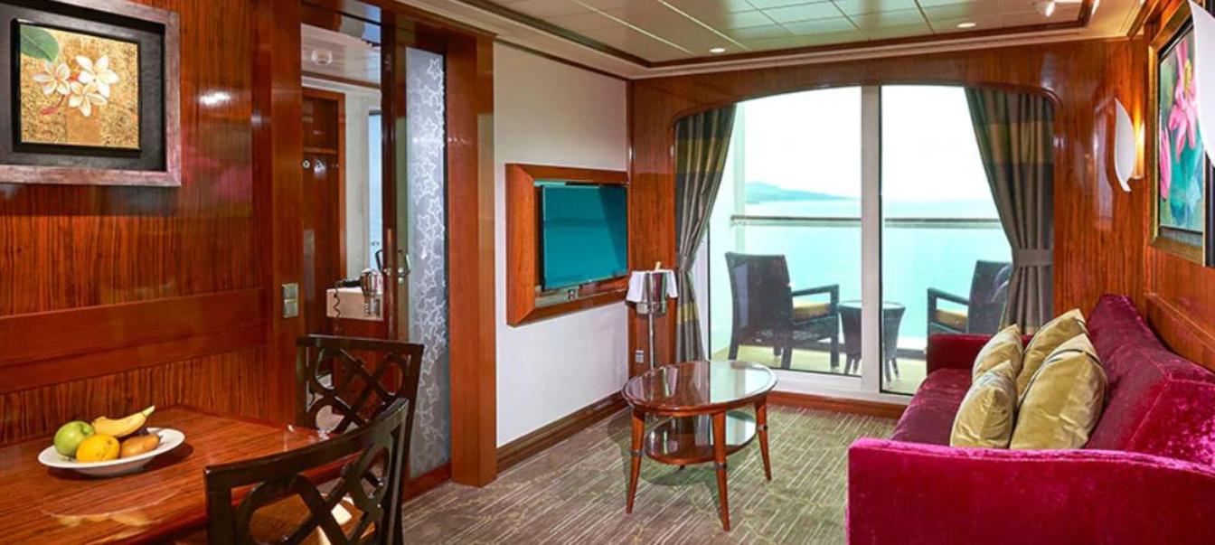 Avec une chambre pouvant accueillir jusqu'à quatre personnes, ces mini-suites comprennent deux lits inférieurs qui se convertissent en un lit queen-size ainsi qu'un coin salon, une baignoire de luxe avec douche, une literie supplémentaire pour accueillir deux personnes supplémentaires et un balcon privé avec une vue magnifique. Parce qu'il s'agit d'une suite mi-bateau, les clients auront un accès facile à tout ce qui se trouve à bord.