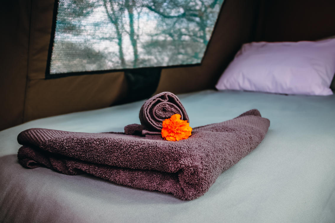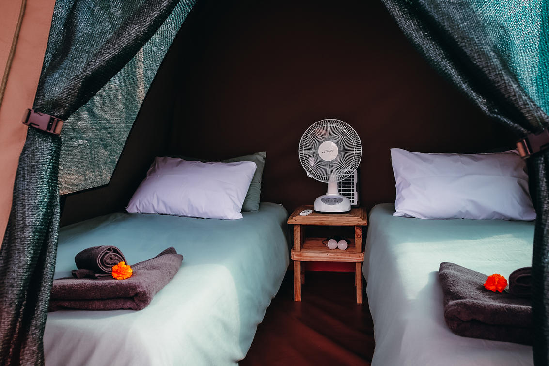 Chaque tente comprend 2 lits simples ou 1 lit double avec draps et serviettes, un petit panneau solaire pour les lumières, un ventilateur et une prise de recharge. La zone principale comprend une cuisine entièrement équipée avec cuisinière à gaz, réfrigérateur et congélateur solaires, coin repas, coin vaisselle, couverts et vaisselle. Un boma pour se détendre le soir au coin du feu de camp tout en admirant le majestueux ciel nocturne. Ses salles de bain et celles pour elle disposent chacune de 3 douches, de 3 toilettes et de 3 vasques. Chaudière à ânes à l'ancienne à proximité des salles de bain pour l'eau chaude dans les douches.