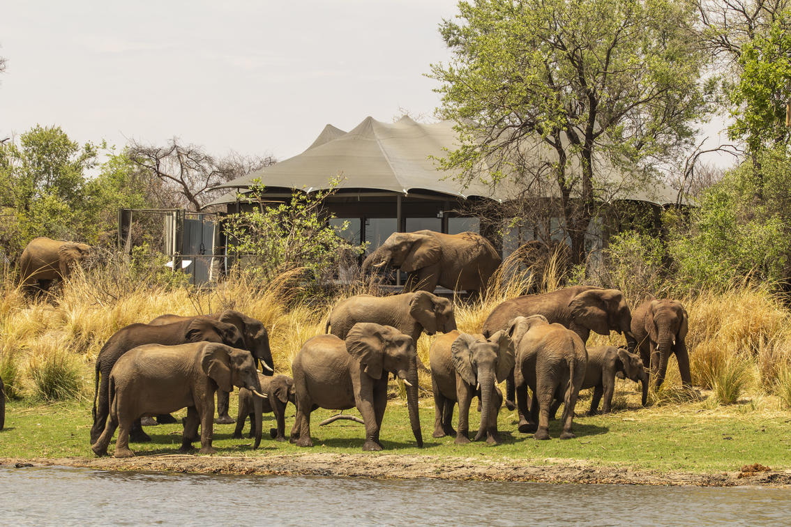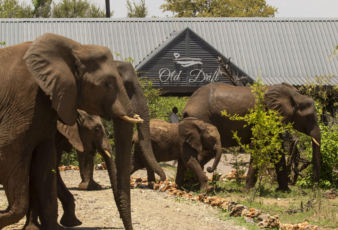 Troupeau d'éléphants visitant le Old Drift Lodge