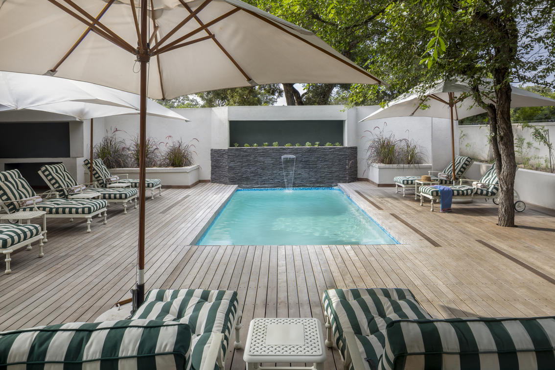 une spacieuse salle de bains privative et un dressing avec de nombreux espaces de rangement, une douche, une double vasque, des toilettes fermées et une porte donnant également sur une douche à effet pluie extérieure.