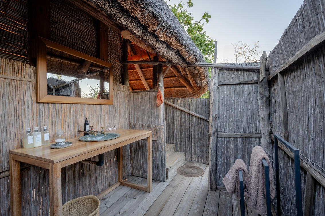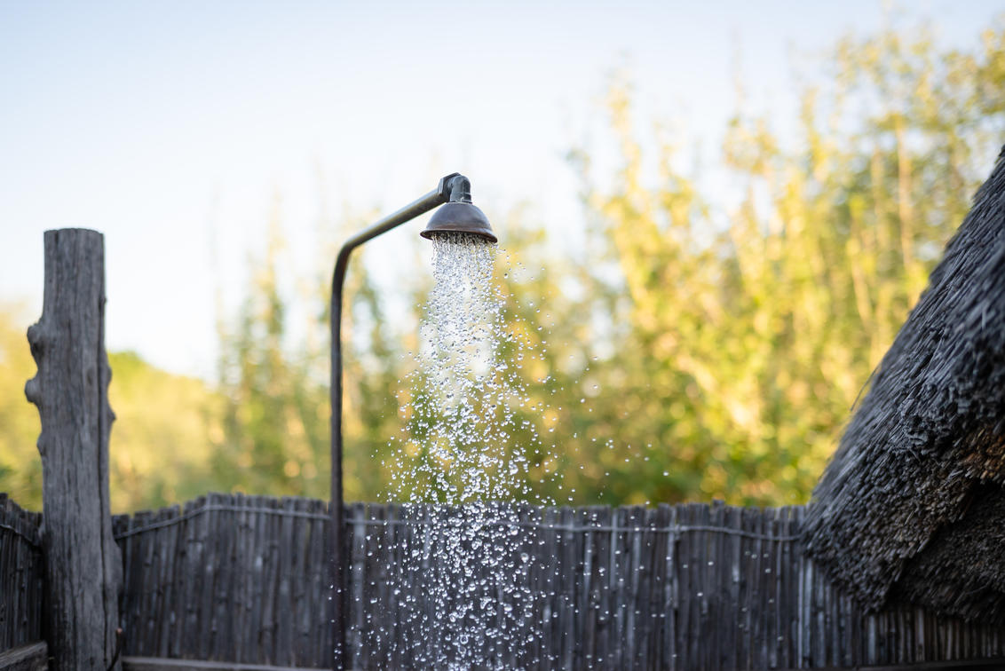 Ogni chalet ha un bagno privato con design a cielo aperto: murato per la privacy, ma aperto verso il cielo in modo da poter fare la doccia sotto le stelle. L'acqua calda è disponibile tutto il giorno.