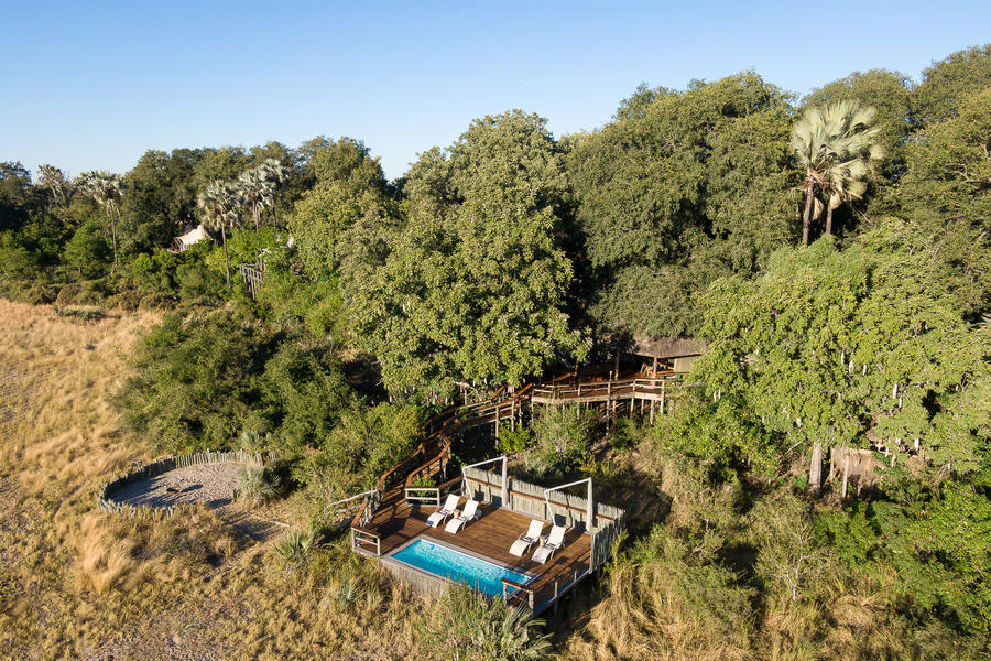 L'area principale comprende una sala da pranzo e un'area lounge situata sotto un fresco tetto di paglia e conduce su un ampio ponte di legno che si affaccia su un'enorme pianura alluvionale spesso punteggiata di selvaggina di pianura. Una vasca immersione ad acqua fredda è il luogo perfetto per rilassarsi o osservare gli animali sottostanti.