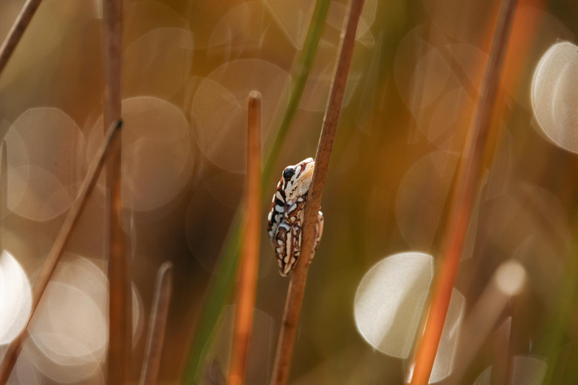 Questa piccola rana di canna ha le dimensioni di un pollice adulto medio.