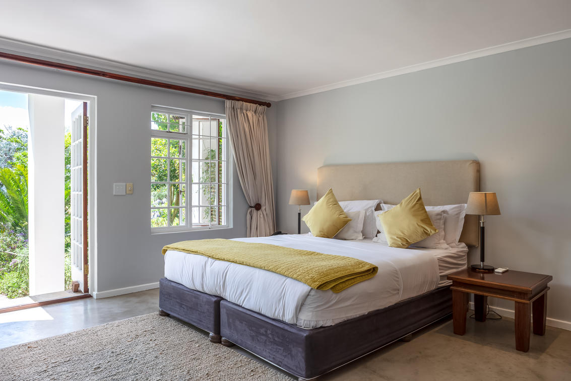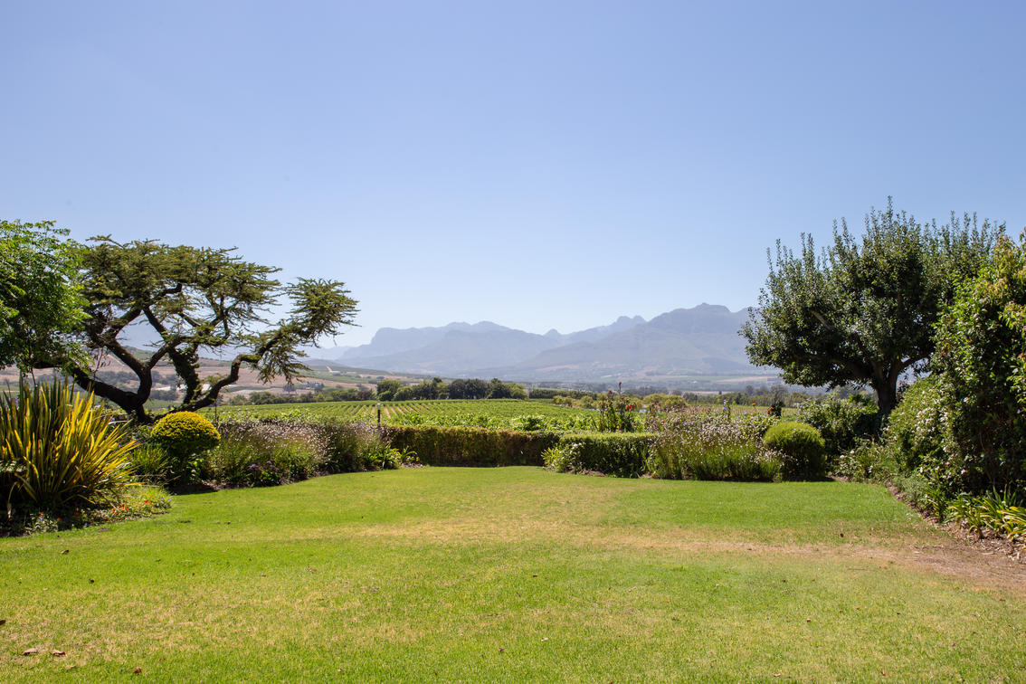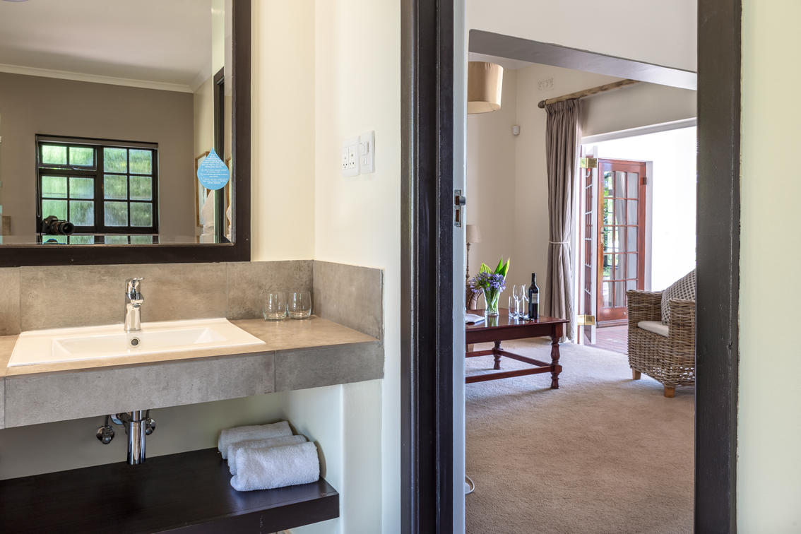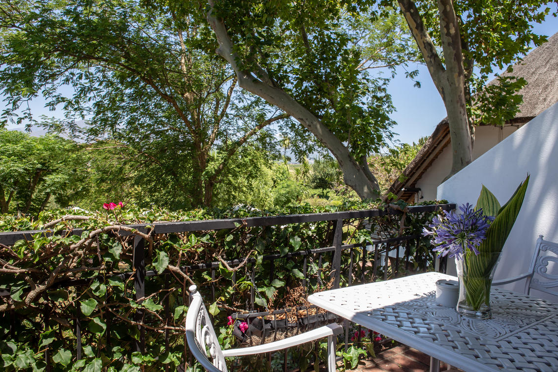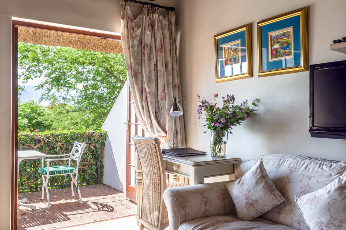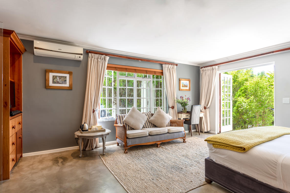 Alle Garden Deluxe kamers (nr. 3, 4, 5 en 6) op de begane grond hebben kingsize bedden, badkamer en-suite met bad en aparte douche en eigen patio met uitzicht op onze uitgestrekte tuinen, Stellenbosch Hill's wijngaarden en bergen.