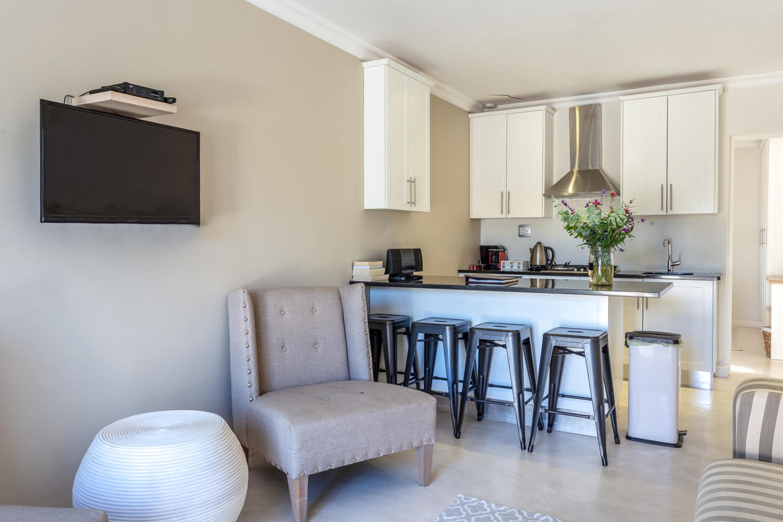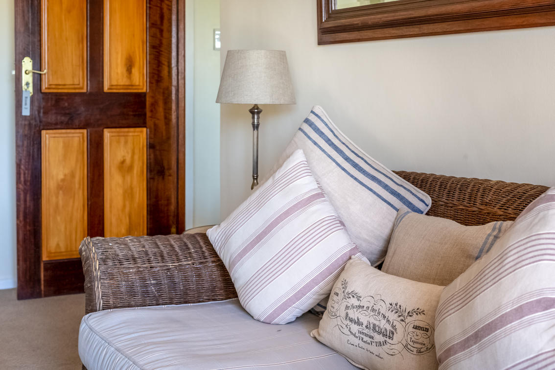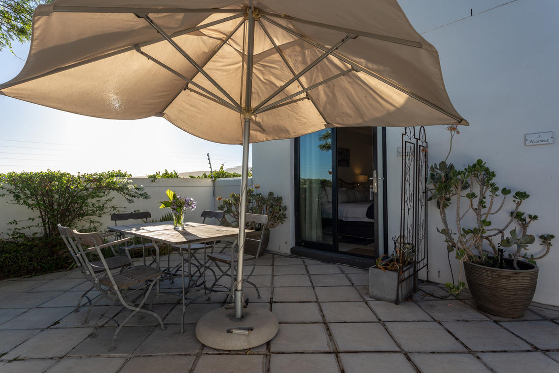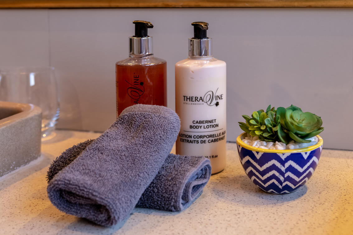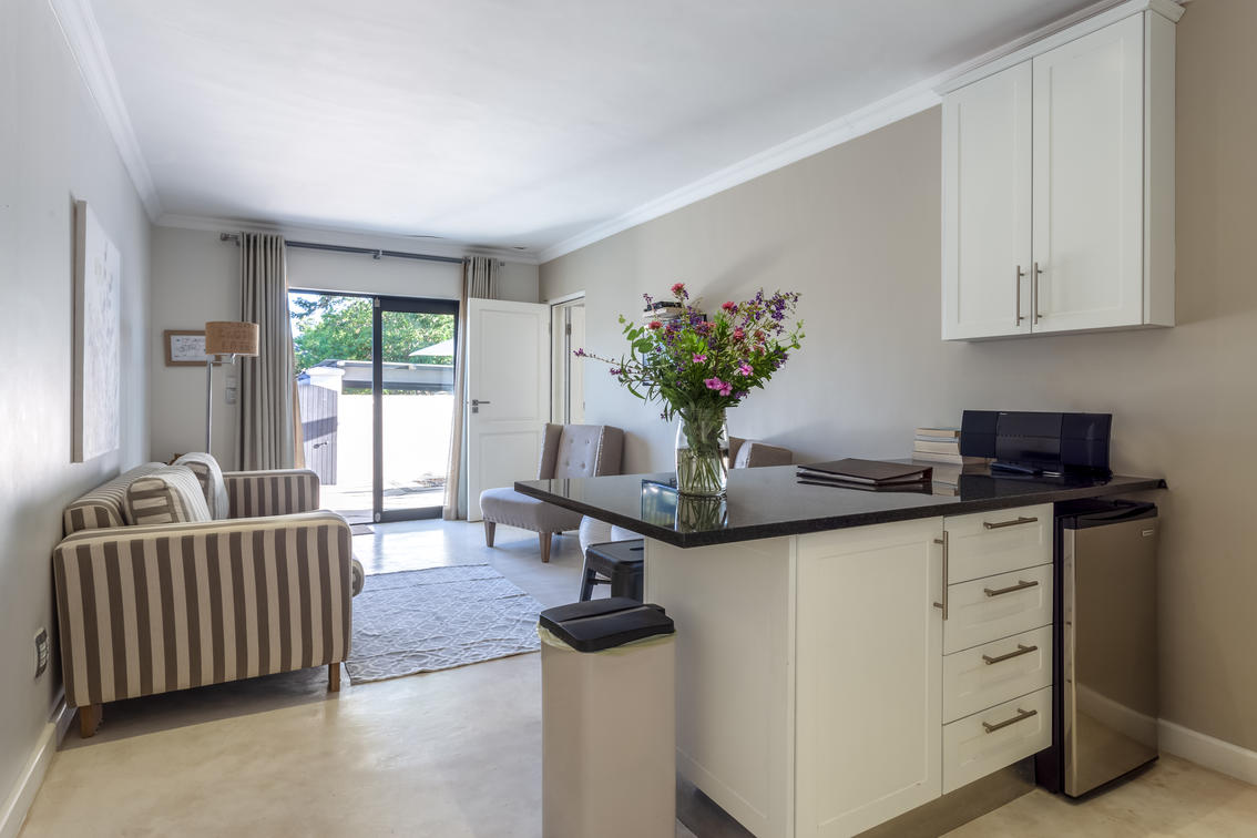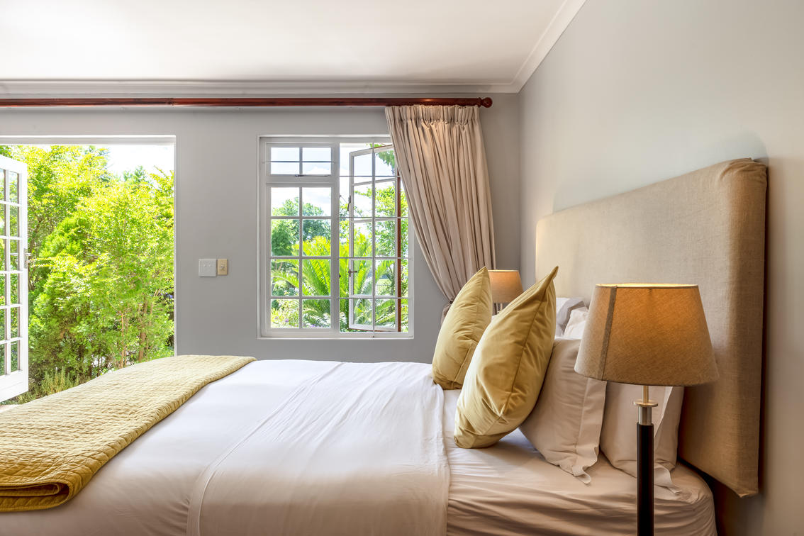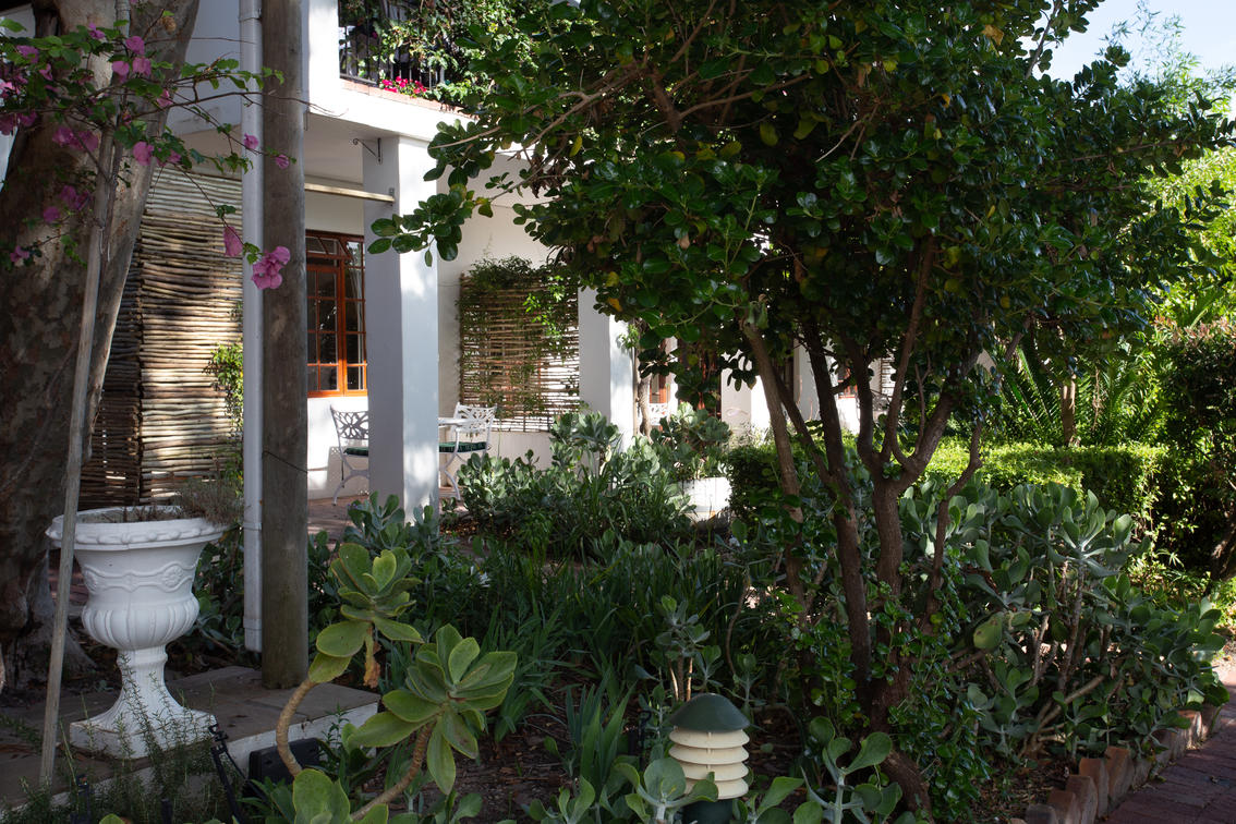 Alle Garden Deluxe kamers (nr. 3, 4, 5 en 6) op de begane grond hebben kingsize bedden, badkamer en-suite met bad en aparte douche en eigen patio met uitzicht op onze uitgestrekte tuinen, Stellenbosch Hill's wijngaarden en bergen.