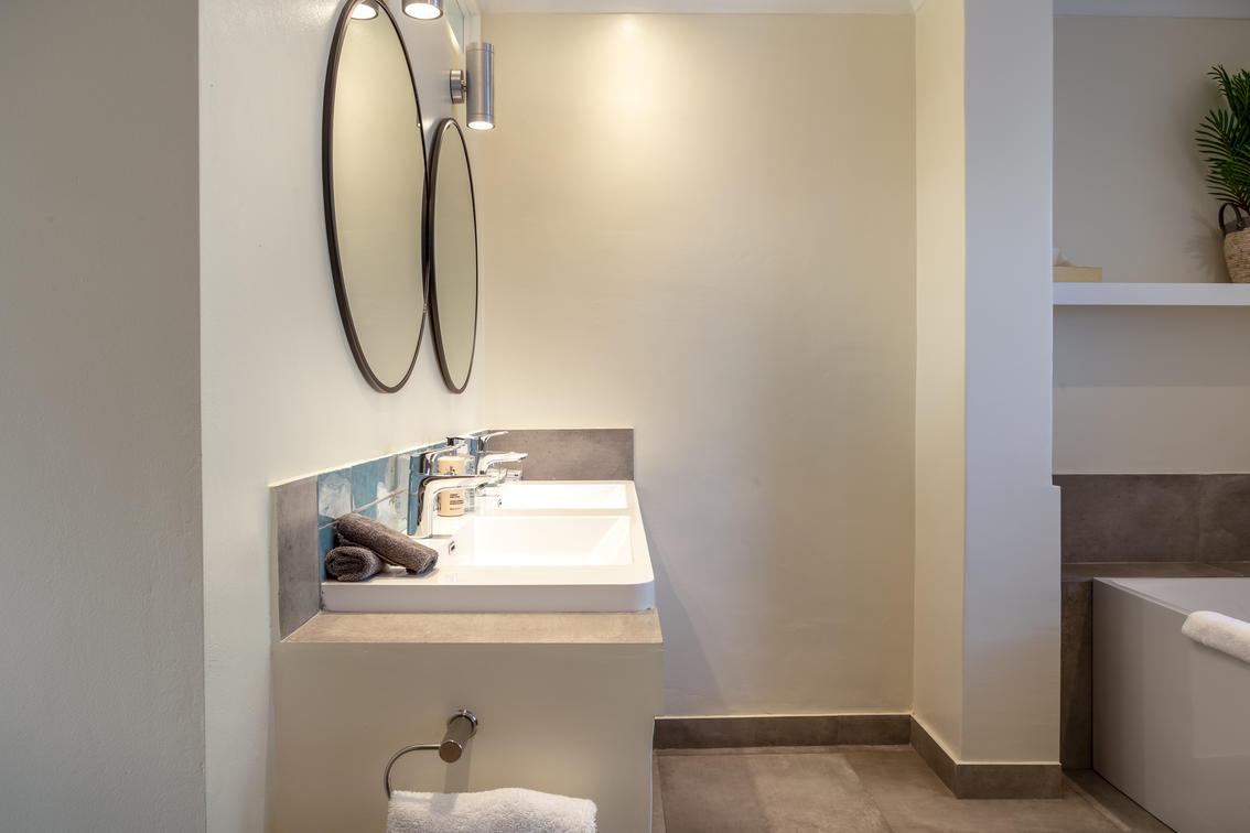 Onze Garden Family Suite op de begane grond heeft 2 slaapkamers met een kingsize bed, gedeelde badkamer en eigen patio aan de voorzijde met uitzicht op onze tuinen en wijngaarden en een eigen patio aan de achterzijde met directe toegang tot het zonne-verwarmde lagunezwembad