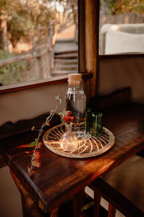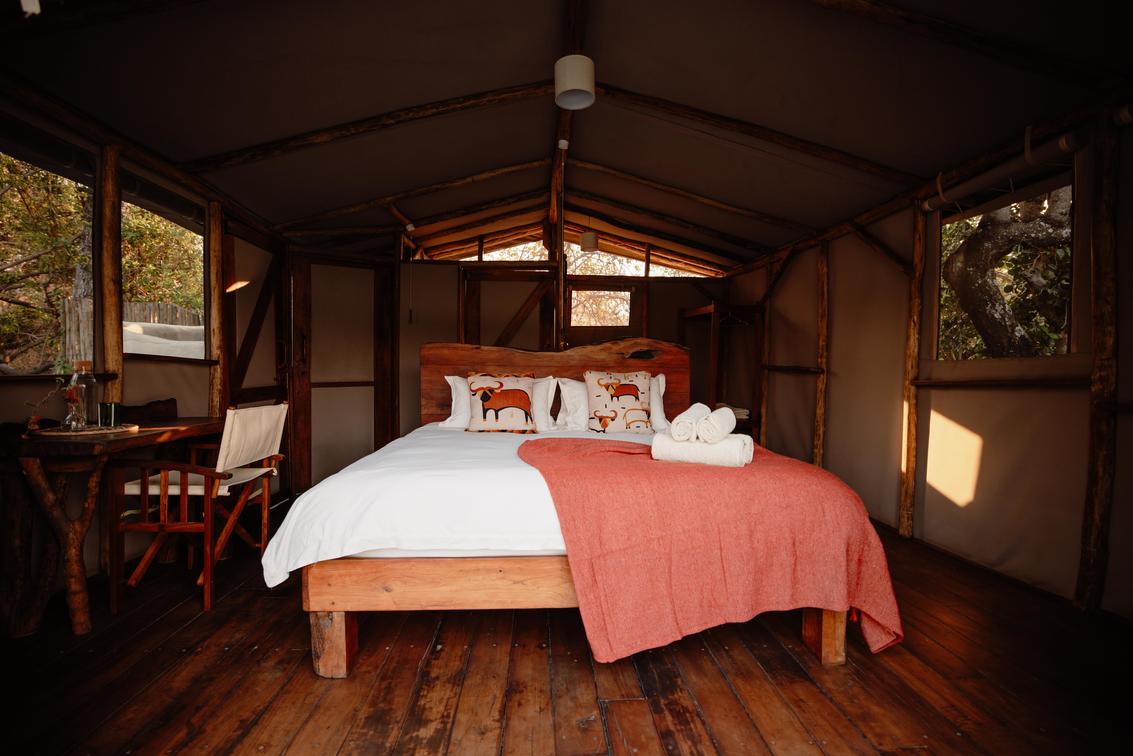 De kamer gaat naadloos op in de natuurlijke omgeving. De buitenkant is gemaakt van lokaal gewonnen hout en de canvas wanden van de tent zorgen voor een gevoel van rustieke elegantie.