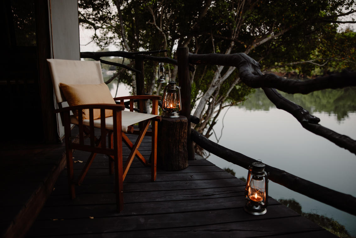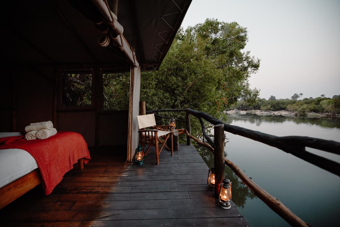 Tweepersoonskamer met veranda, ensuite toilet en wastafel en een openlucht regendouche met uitzicht op de Kafue-rivier. De privé veranda is een ideale plek om te ontspannen, een boek te lezen of de wilde dieren te bewonderen die langs de rivieroevers leven.