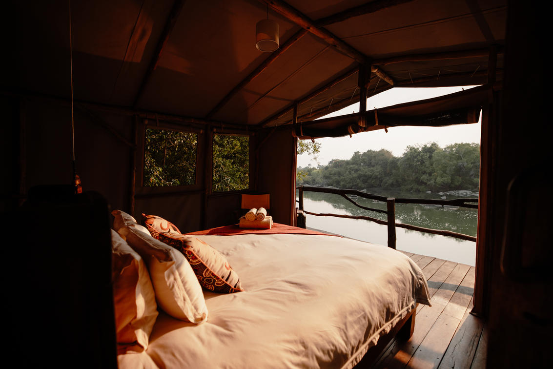Het middelpunt van het chalet is een comfortabel en luxueus queen size bed, opgemaakt met lakens van Egyptisch katoen van hoge kwaliteit. Vanuit je bed heb je uitzicht op de rivier en wordt je wakker met de zonsopgang en het rustige geluid van stromend water op de achtergrond.