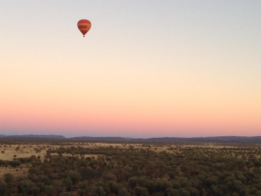 Dagen din begynner i det kjølige mørket før daggry når du blir plukket opp fra din overnatting i Alice Springs. Under kjøringen til vår ørkenlansering området vil du bli kjent med mannskapet som de gjør siste værsjekker og forklare rutinene for morgenen. Ballongflyturen foregår sør for Alice Springs over historiske Owen Springs stasjon ved siden av MacDonnell Ranges. Når flytende forsiktig i luften vil du sette pris på den enorme avstanden til den australske Outback. Dyreliv, spesielt store røde kenguruer er sett nesten hver dag som ballongen krysser spinifex gress, mulga skrubb og kvegstasjoner. Etter landing kan du bli involvert i å bistå mannskapet eller ta bilder mens vi pakker ballongen tilbake i sekken. Forfriskninger (et utvalg av muffins, skiver og kjeks, ost og frisk frukt) ledsaget av australsk musserende vin og fersk juice vil bli servert «i bushen» etter hvert fly. En flott mulighet til å nyte stillheten i ørkenen og dele historier med mannskapet og andre passasjerer. Returoverføringer til din innkvartering eller en annen tur og et suvenirflysertifikat fullfører morgeneventyret.