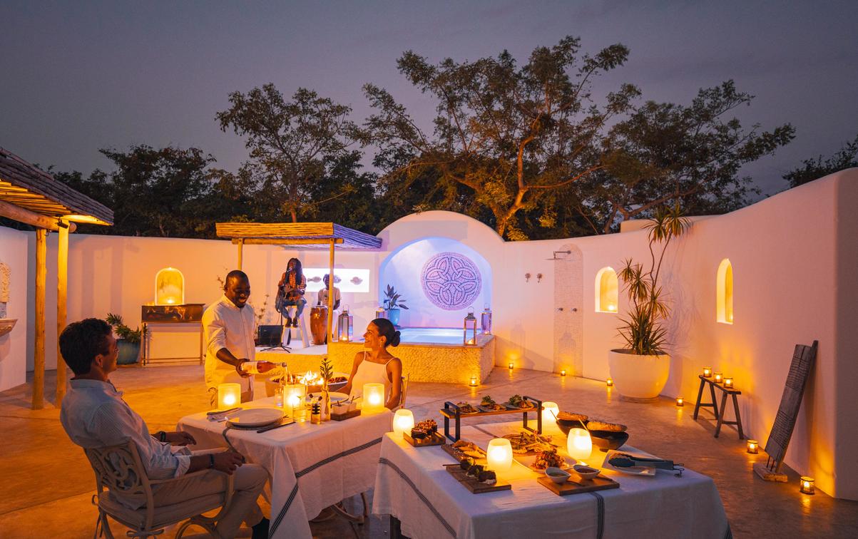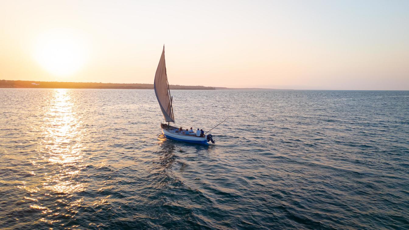 Dhow safari - Vedta et lavere tempo og sett seil på Santorinis tradisjonelle dhow, et håndlaget trefartøy med særegen lateen rigging. Den eldgamle kunsten med dhow-reiser har blitt praktisert i denne regionen i århundrer, der fedre har gitt håndverket med å skipe dhows til sønnene sine gjennom generasjoner. Brukes fortsatt i dag, det er en viktig del av hverdagen i Kingfisher Bay. Dhow reiser er avslappet, enkel og rolig - den perfekte måten å oppleve en solnedgang i Mosambik. Delte solnedganger er tilgjengelige på Santorinis dhow, men det kan også bestilles eksklusivt for det typiske romantiske solnedgangscruiset. Sett deg inn i komfortable puter for en avslappet solnedgangsopplevelse, komplett med kanapeer fra Santorinis kokker.