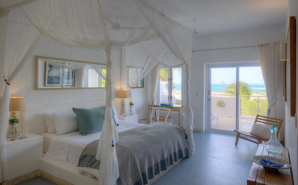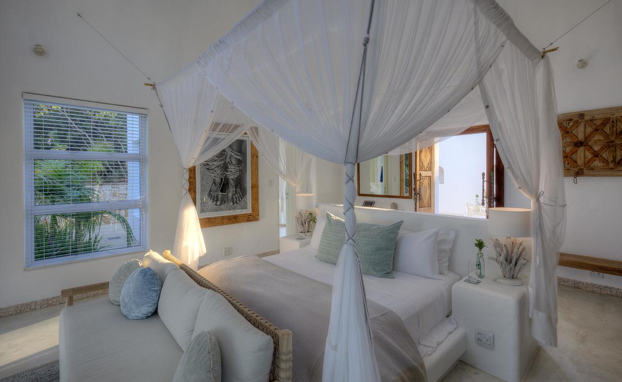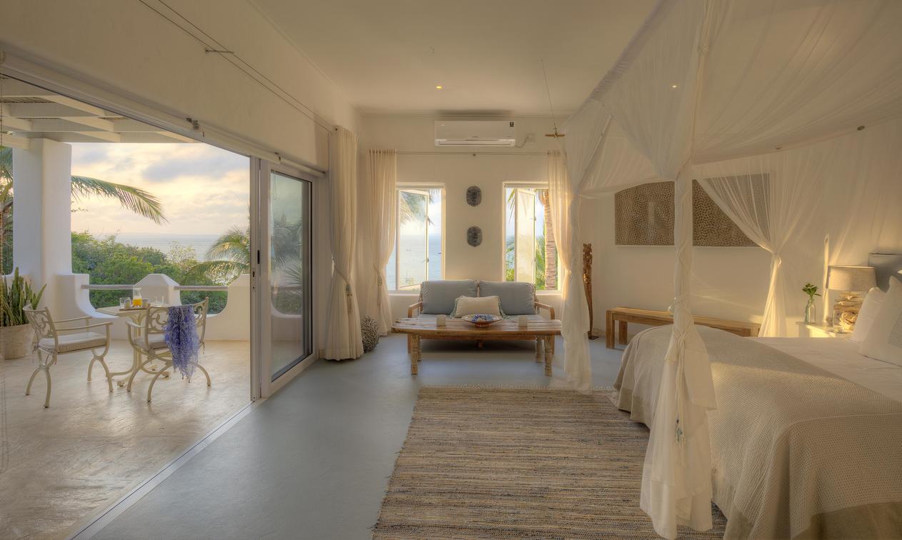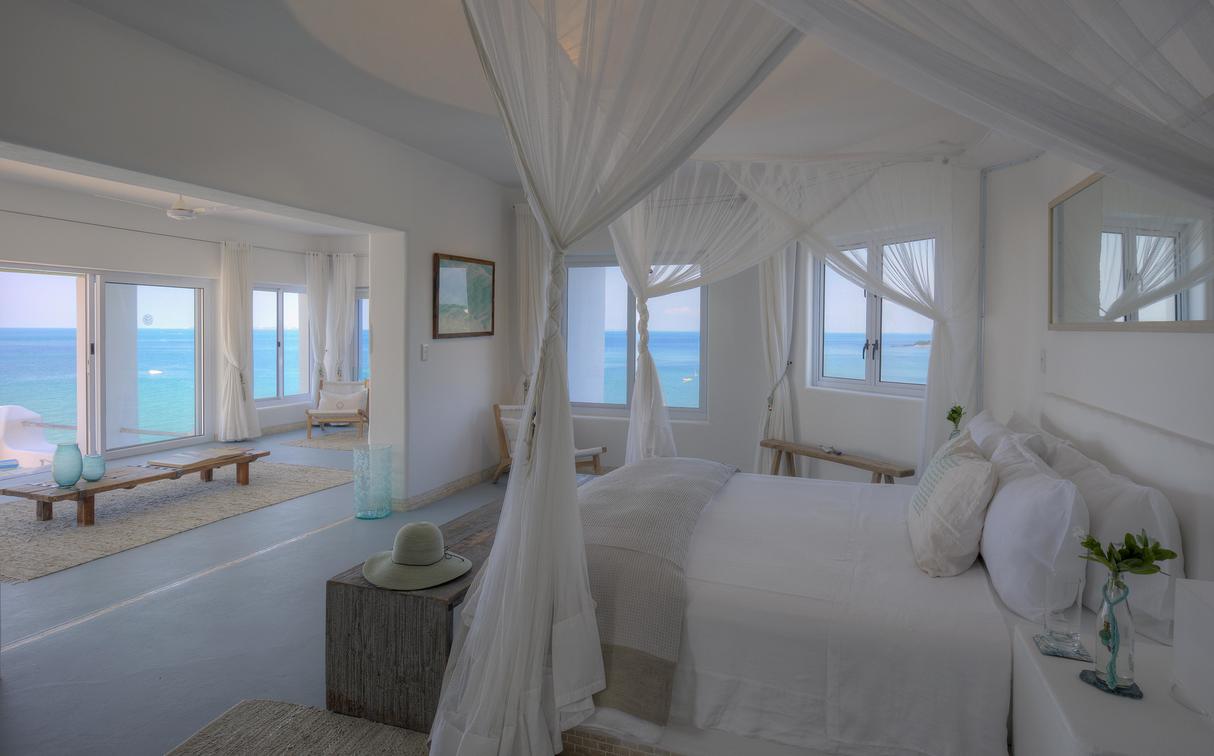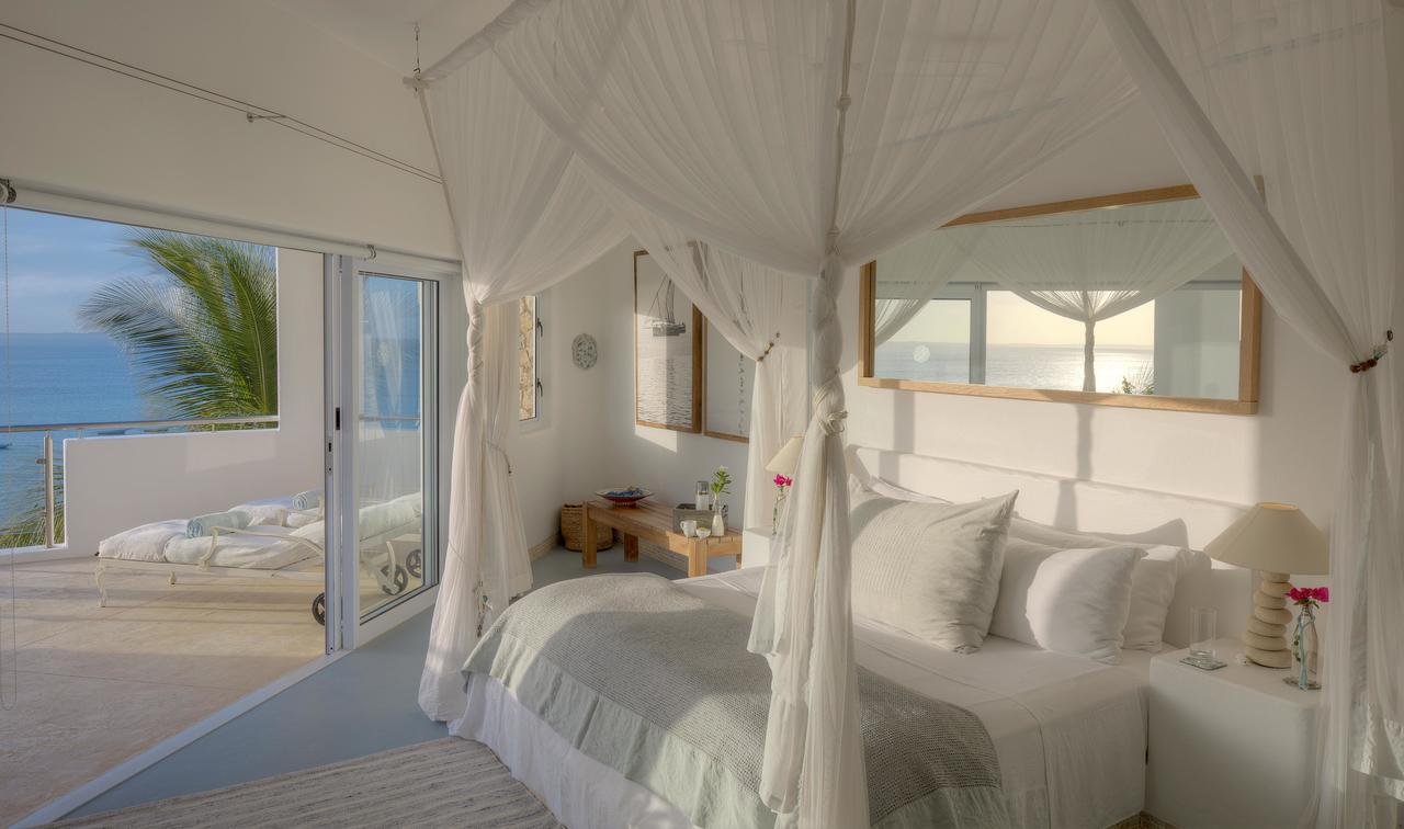 Soverommet har king-size-seng som vender mot sjøen, drapert myggnett og skarpt hvitt sengetøy for en perfekt natts søvn eller en rolig ettermiddagslur.