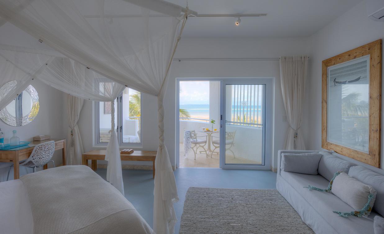 Luksuriøst romslig, Bazaruto Suite kombinerer innendørs og utendørs liv med en sømløs skyvedør i glass som ønsker deg velkommen til en privat uteplass med uovertruffen havutsikt. Suiten har king-size-seng, stue, arbeidsområde og eget elegant bad med imponerende dobbel dusj, dobbel servant og toalett. Badekaret og dusjen med havutsikt venter på terrassen, gjemt bak et håndlaget steingardin.