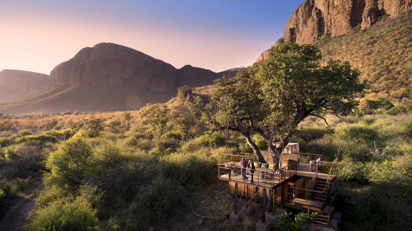 møblerte dekk med utsikt over Waterberg og over den frodige vidden av Marakele. Gjester, levert med safarikjøretøy sent
