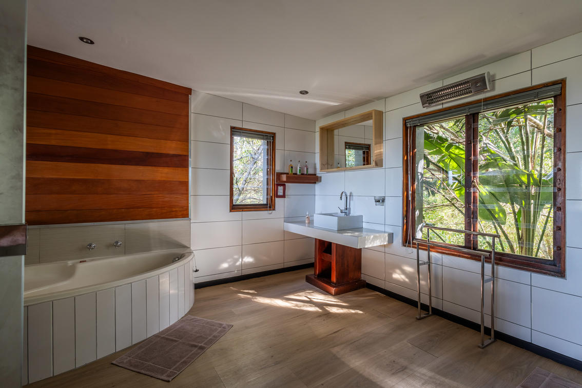 Zakwaterowanie dwukondygnacyjne. Polozony w bujnych ogrodach otaczajacych glówny domek. Lózko dwuosobowe lub 2 lózka pojedyncze, z lazienka (oddzielna wanna i prysznice) czescia wypoczynkowa i prywatnym drewnianym tarasem na górnym i dolnym poziomie.