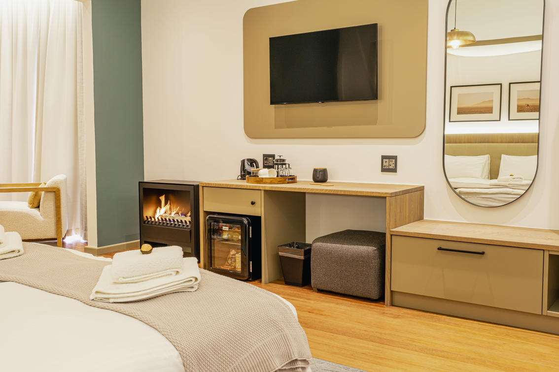 Cada uma das nossas 3 suítes tem um lounge separado e uma lareira. Há espaço suficiente para adicionarmos uma cama extra ou duas para famílias. Todos os quartos estão completos com frigobar, televisão e cafeteira. Todos os nossos quartos estão equipados com plugues Euro e USB de 3 pontos.