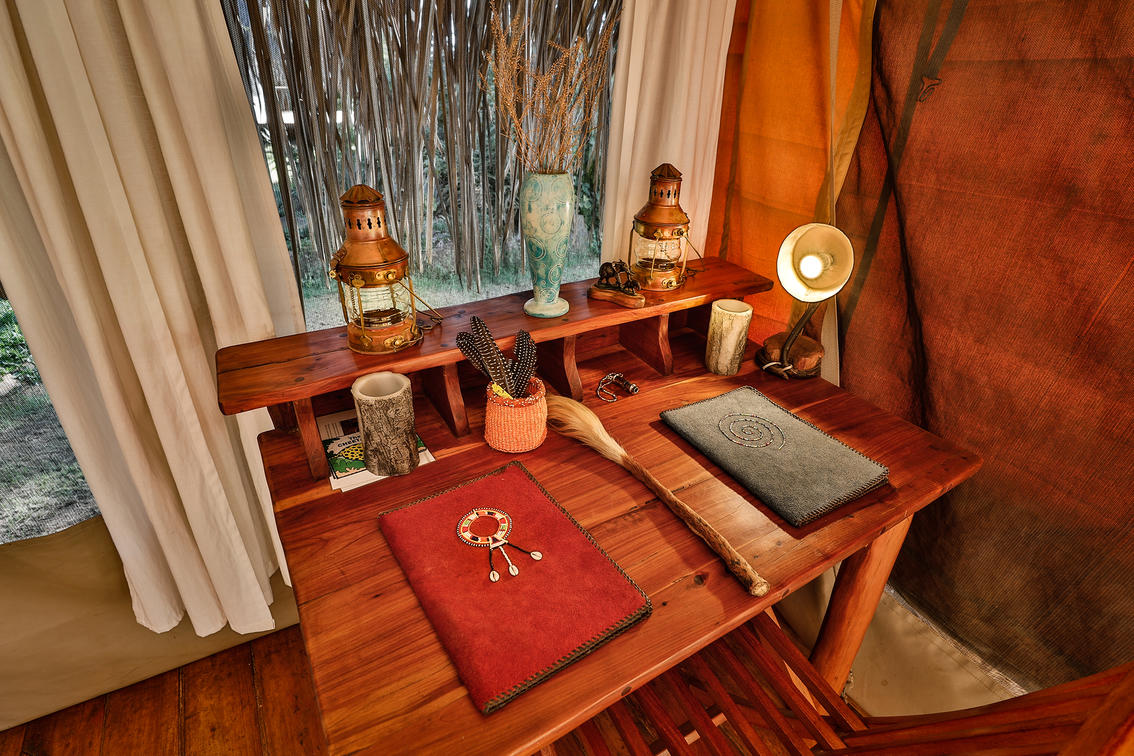Todos os esforços são feitos para minimizar o uso de produtos plásticos. A água potável é fornecida em garrafas de vinho recicladas nas tendas e garrafas de água reutilizáveis nos safáris. Usamos garrafas de vidro recicladas para copos feitos por um artesão local. O sabonete, xampu, condicionador e loção que fornecemos são ecológicos e livres de produtos químicos.