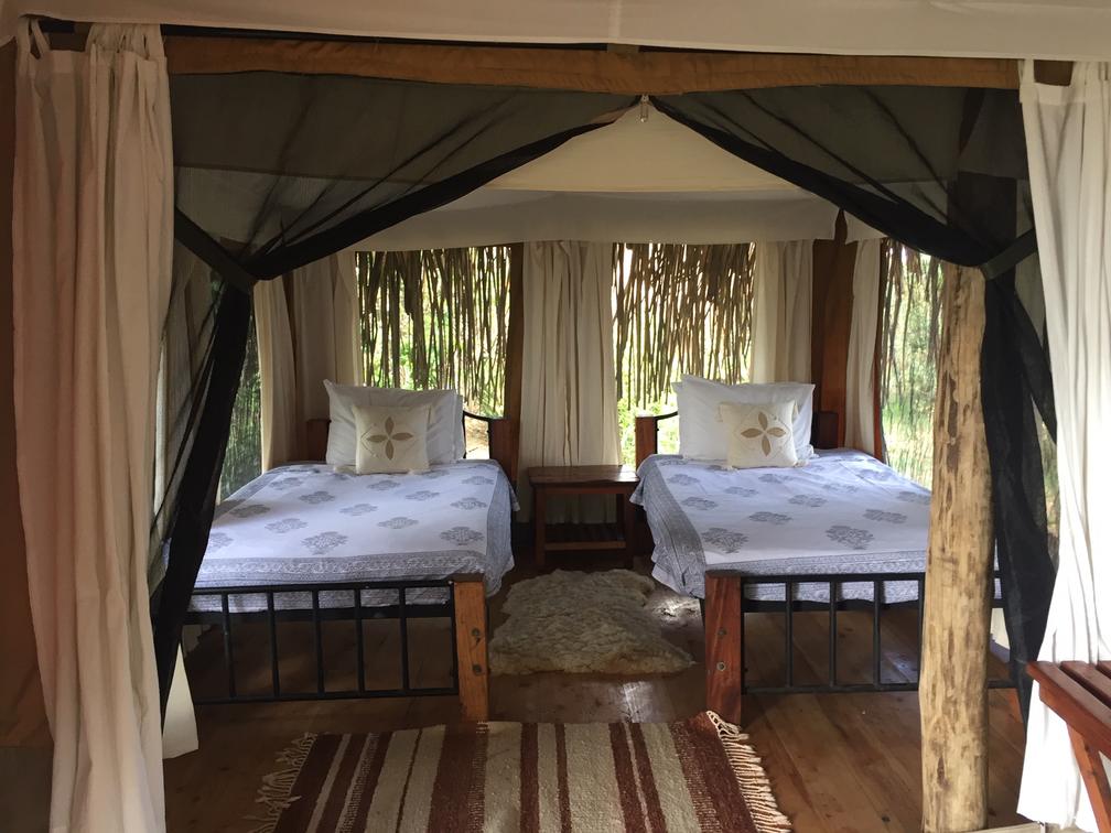 Cada barraca é erguida em decks de madeira e tem banheiro privativo com água corrente quente e banheiros com descarga.