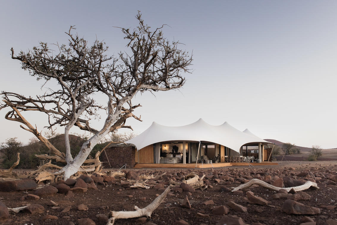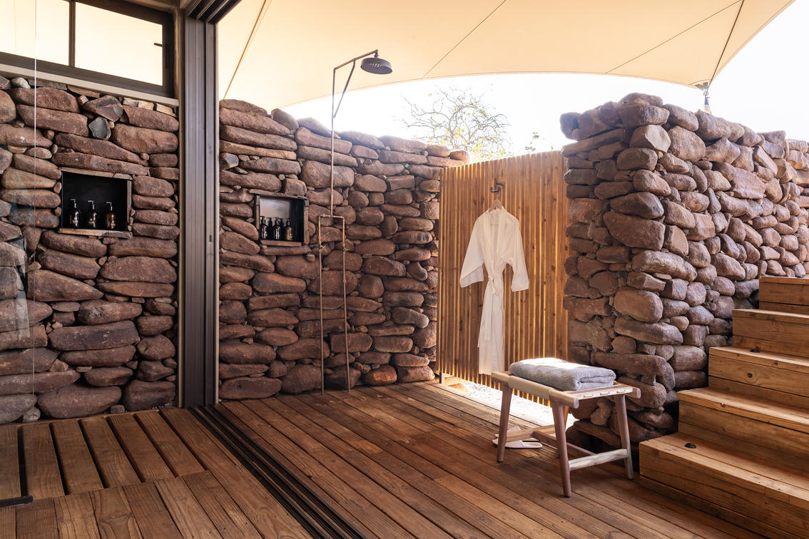 Utilizando estratégias arquitetônicas inteligentes, o redesenhado Wilderness Desert Rhino Camp se concentra no conforto, criando um refúgio protegido em um ambiente desértico ocasionalmente hostil, mas sempre deslumbrante. A forma e a materialidade arquitetônicas se inspiraram na terra cor de cobre, nas rochas vermelhas que cobrem o solo e nos contornos das colinas que definem a paisagem.