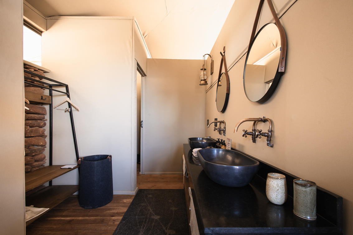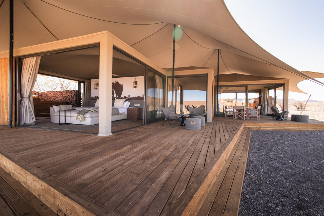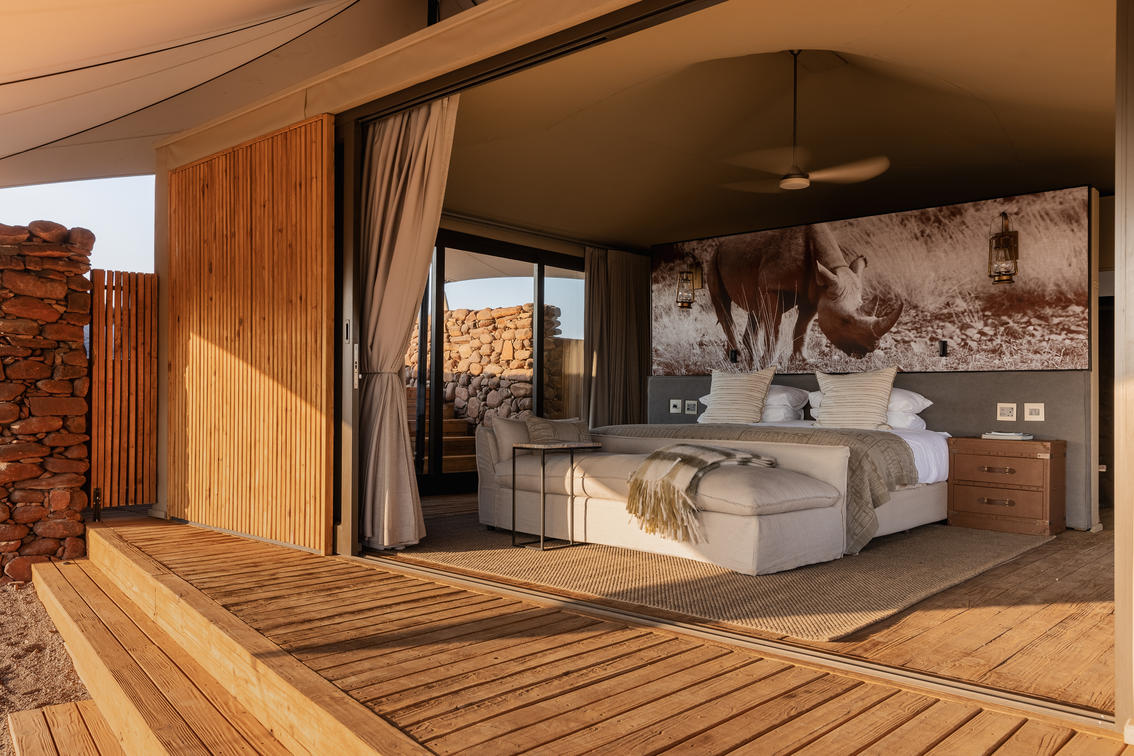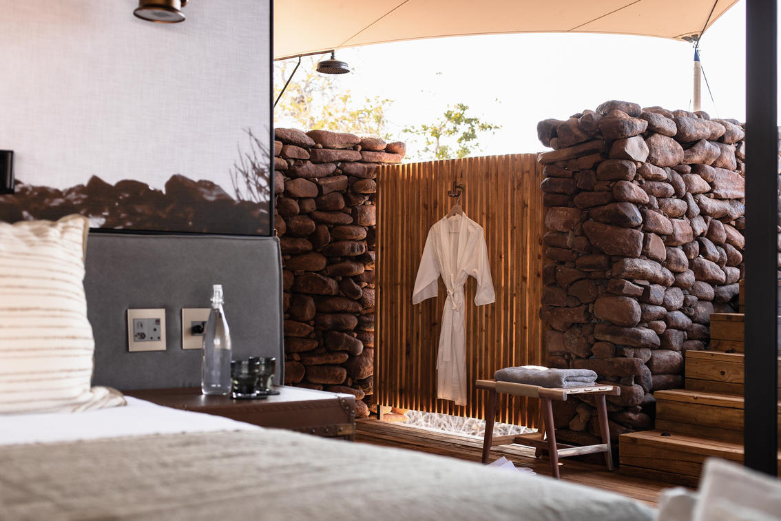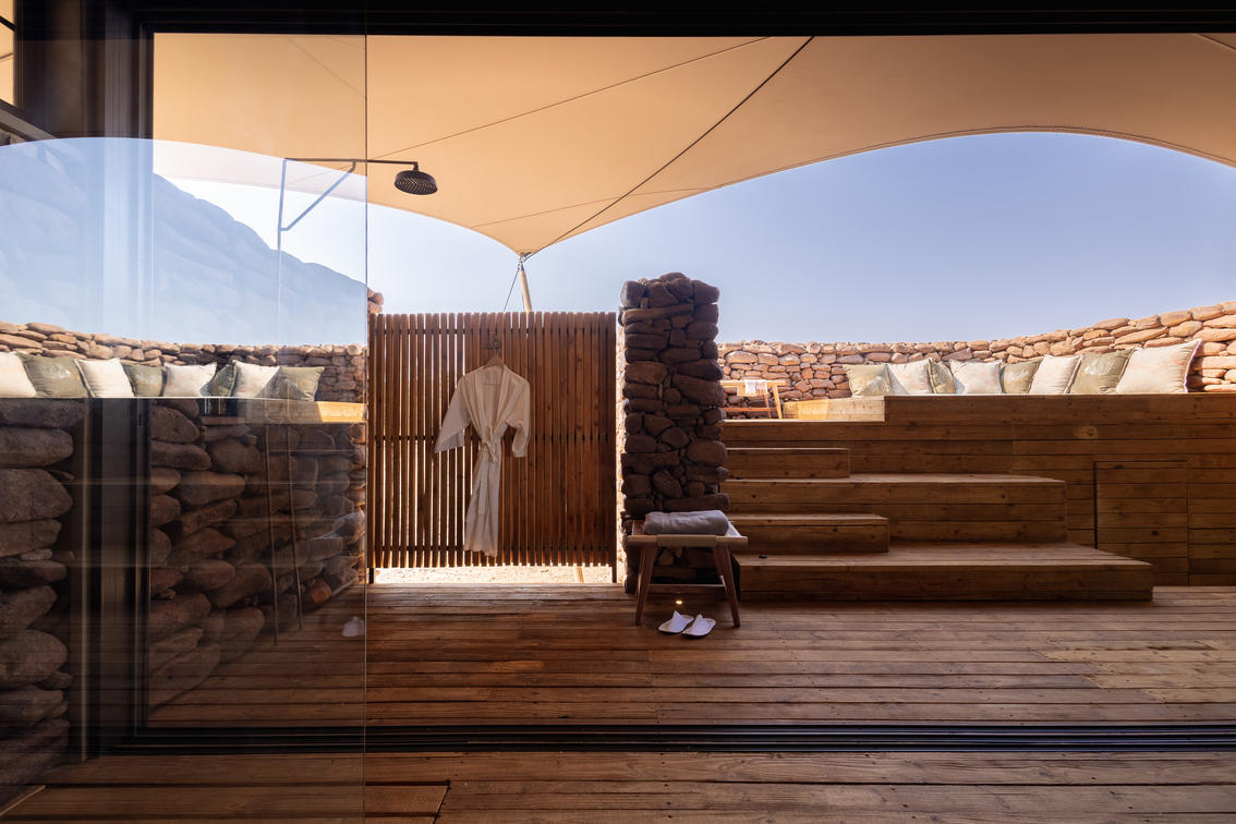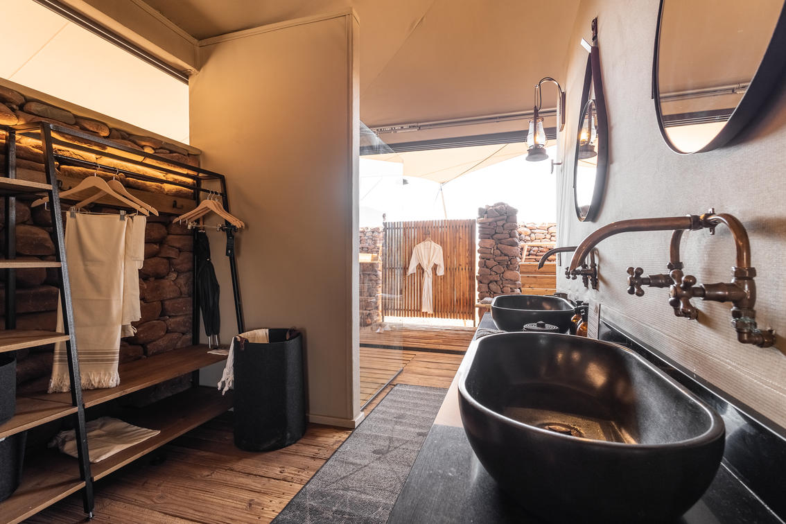 Todas as cinco tendas estão voltadas para a paisagem acidentada do deserto, com estruturas profundas de teto de tecido elástico que oferecem proteção contra o sol do deserto, preservando as vistas deslumbrantes do horizonte, dentro dessa paisagem desértica de tirar o fôlego. Os interiores suaves exibem pedra, madeira e couro, celebrando a era clássica dos exploradores, ao mesmo tempo em que combinam perfeitamente estilo moderno e sofisticação.