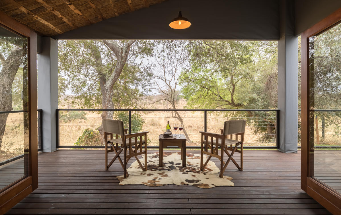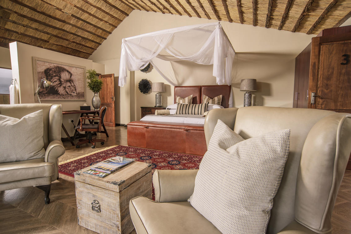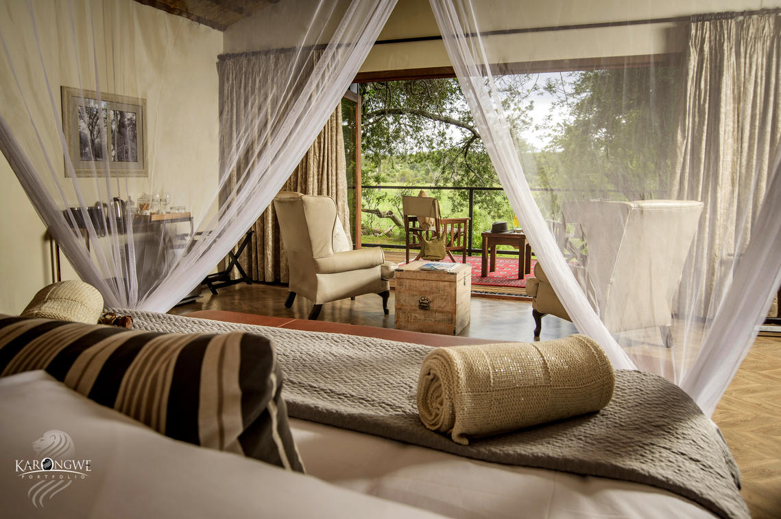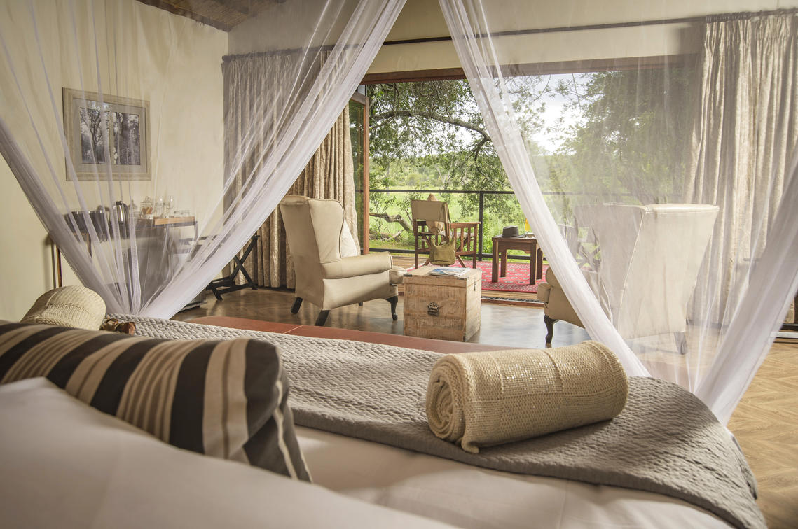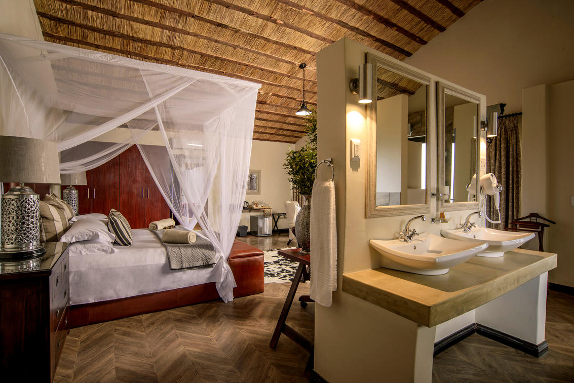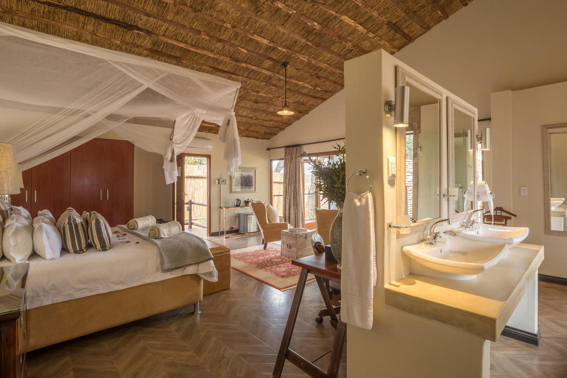 Dois conjuntos de suítes adjacentes (podem ser usados para famílias), de frente para o Rio Makhutswi. Uma paleta de prata, carvão e cinza elefante em uma variedade de materiais modernos suntuosos cria um ambiente elegante e contemporâneo em cada suíte expansiva. Camas King-size.