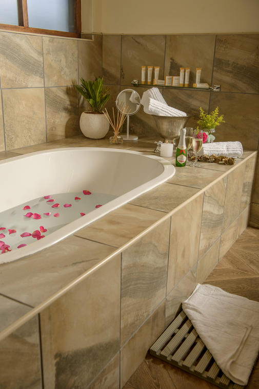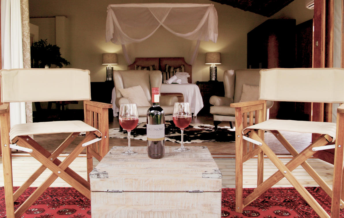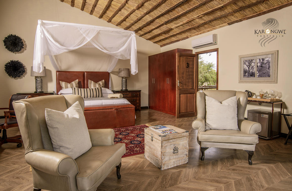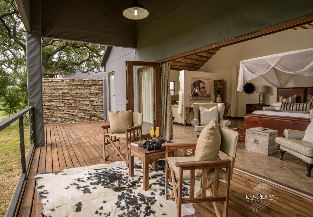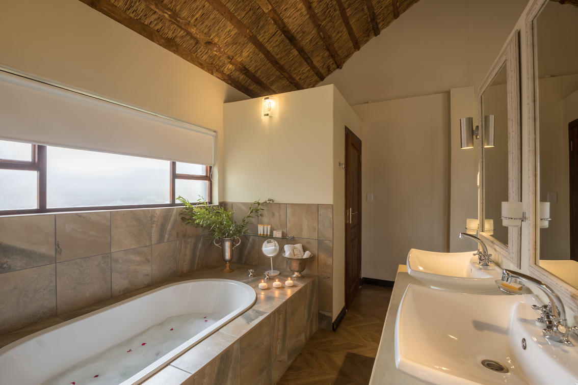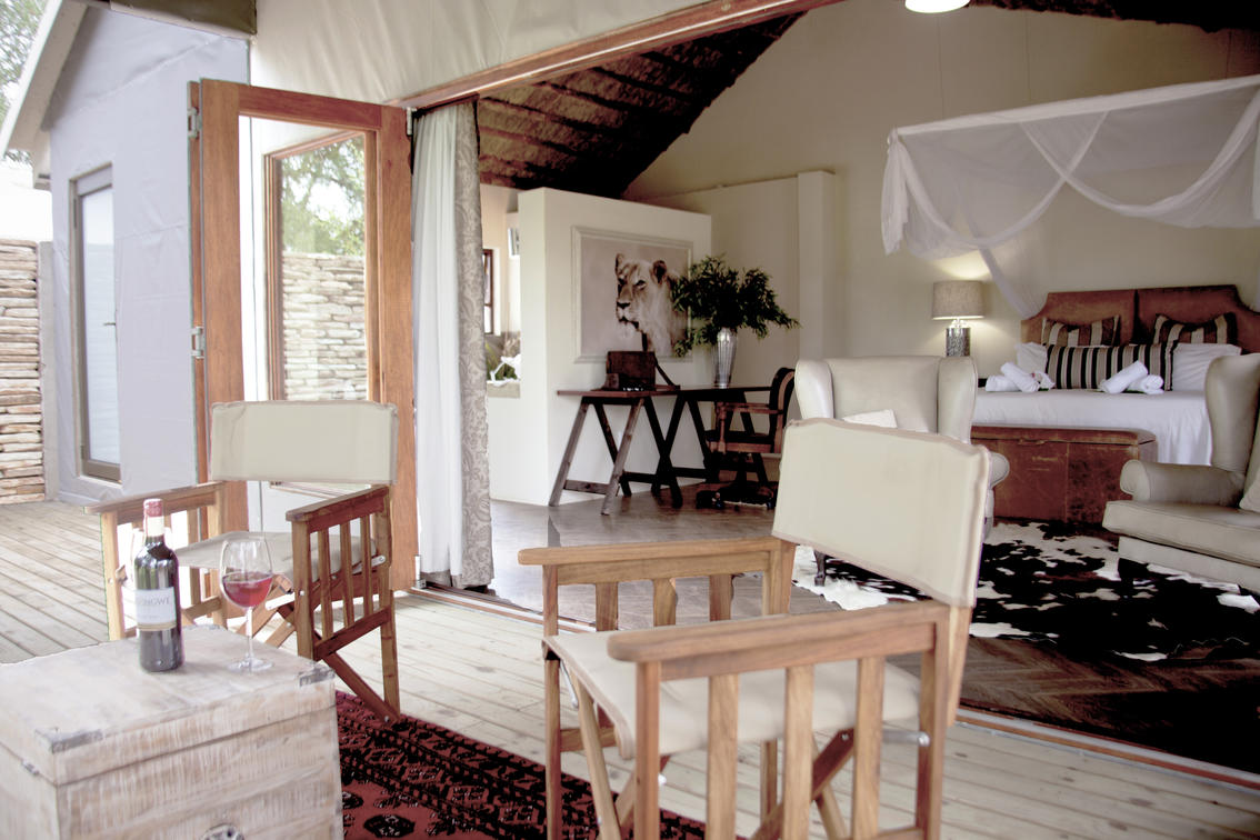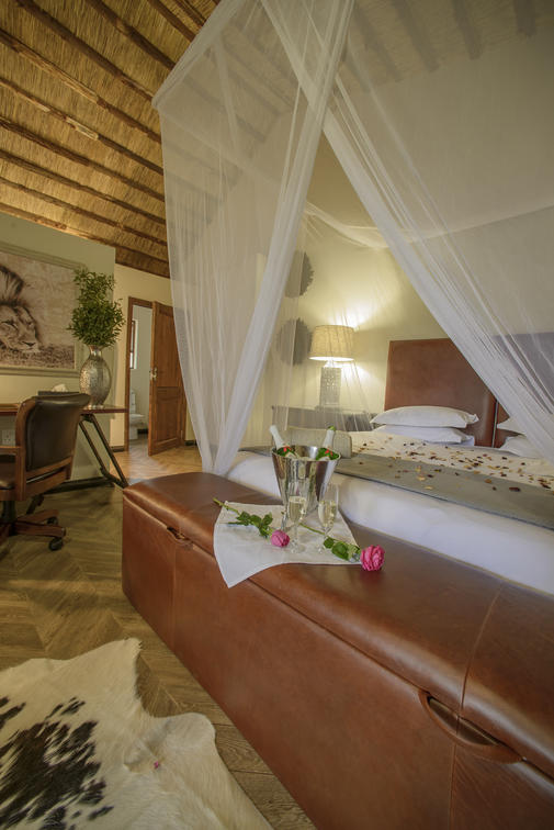 Dois conjuntos de suítes adjacentes (podem ser usados para famílias), de frente para o Rio Makhutswi. Uma paleta de prata, carvão e cinza elefante em uma variedade de materiais modernos suntuosos cria um ambiente elegante e contemporâneo em cada suíte expansiva. Camas King-size.