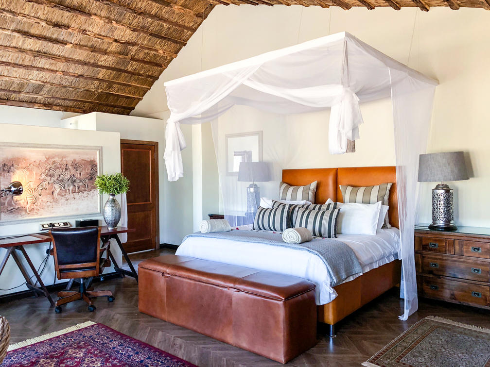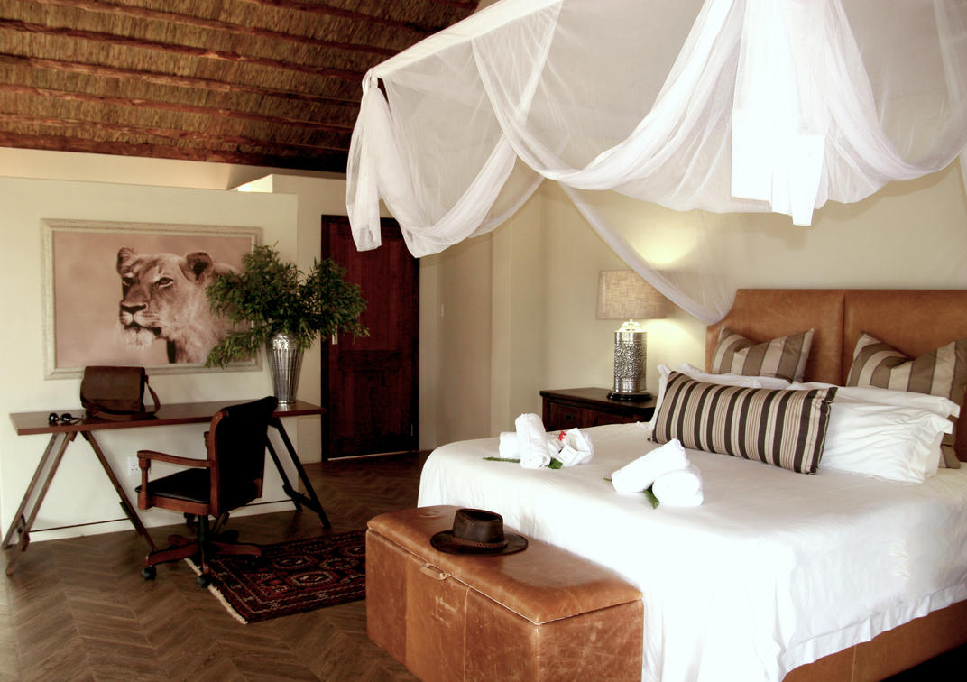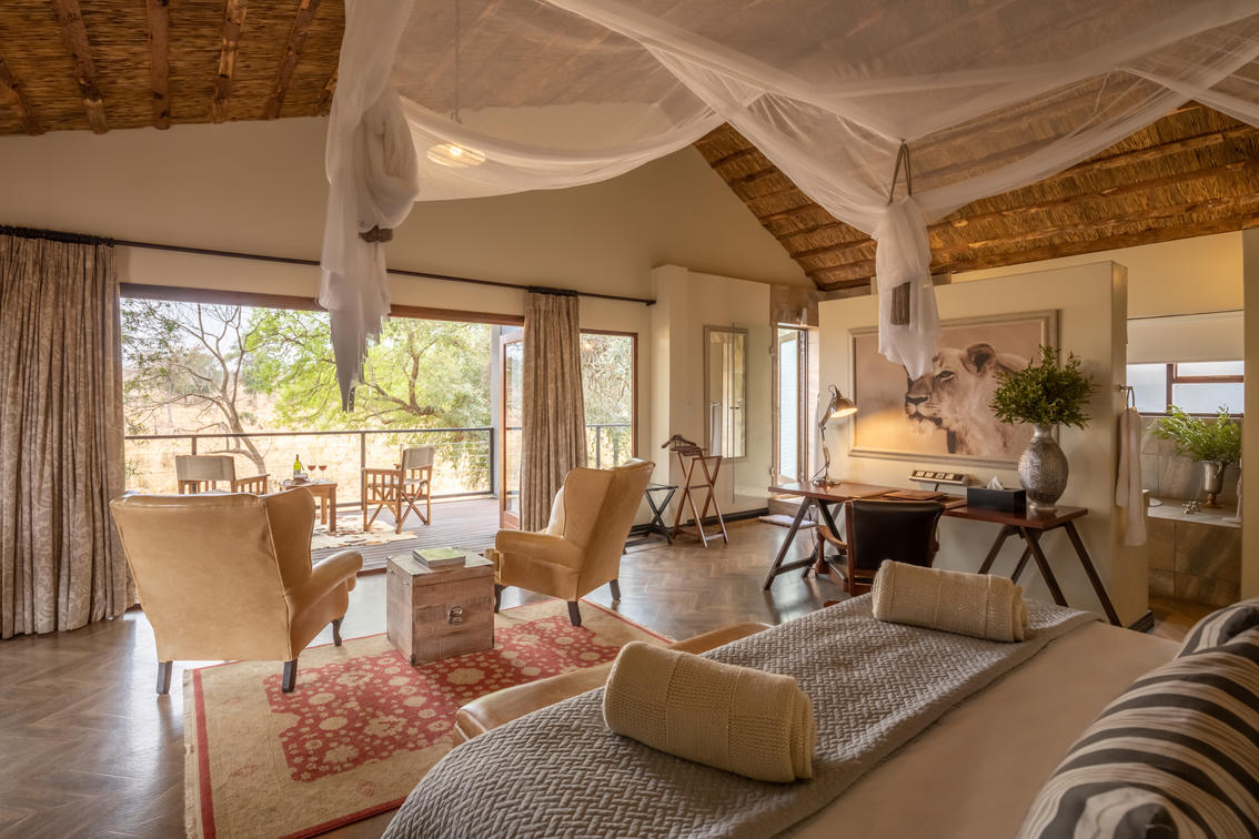 Suite Luxo virada para o Rio Makhutswi. Uma paleta de prata, carvão e cinza elefante em uma variedade de materiais modernos suntuosos cria um ambiente elegante e contemporâneo em cada suíte expansiva. Camas King-size.