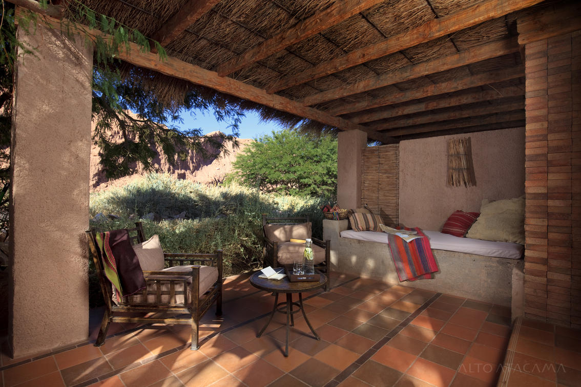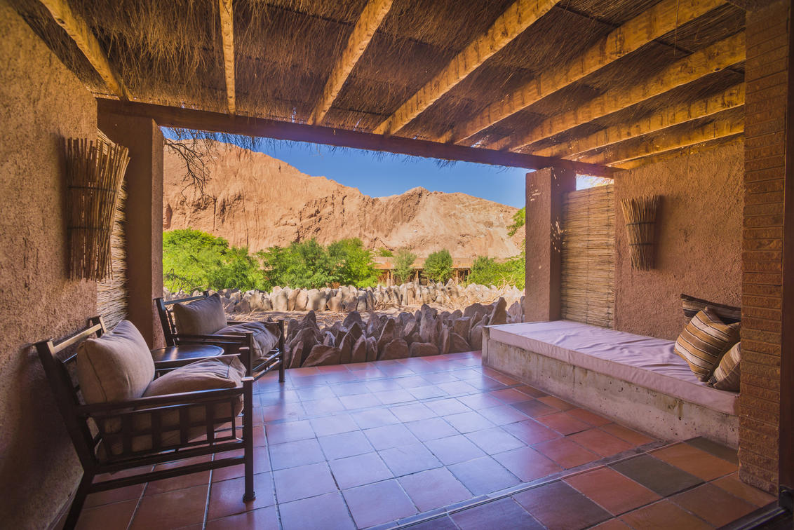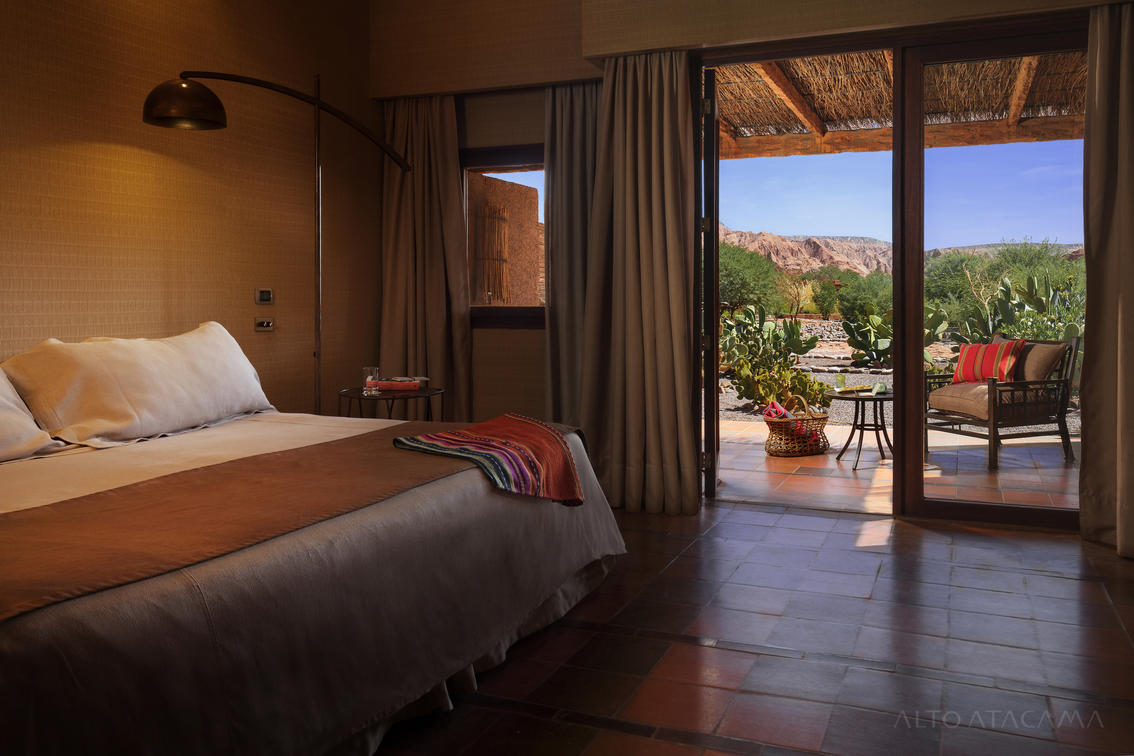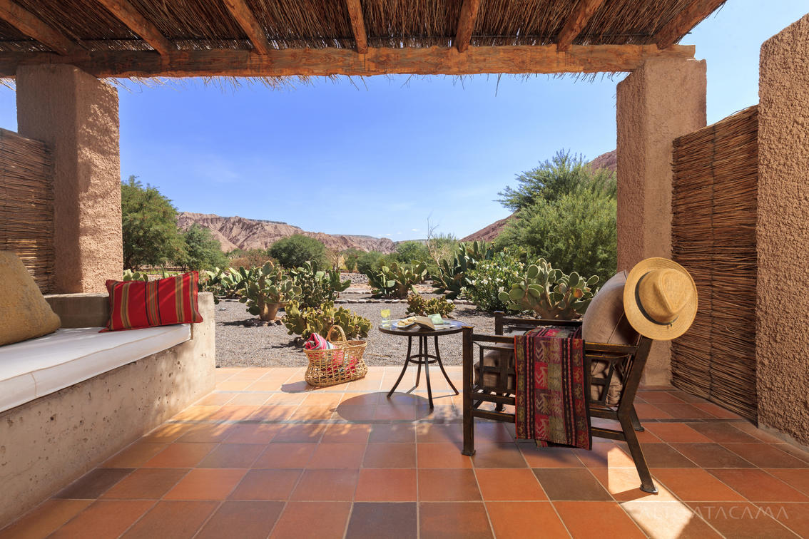 Espaçosos e adornados com materiais naturais locais, os quartos Catarpe refletem as cores brilhantes do vizinho deserto do Atacama. De dentro, você pode ouvir os sons do rio San Pedro descendo da Cordilheira dos Andes até o vale; e ao sair para o terraço, você desfruta de vistas deslumbrantes da Cordilheira do Sal. O sol do deserto é filtrado pelo teto profundo, dando aos quartos uma temperatura e luminosidade ideais, desde o momento em que você acorda até dormir.