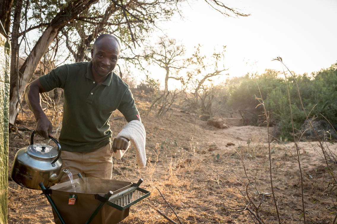 Cada tenda tem seu próprio lavatório de mão. vaso sanitário e chuveiro balde