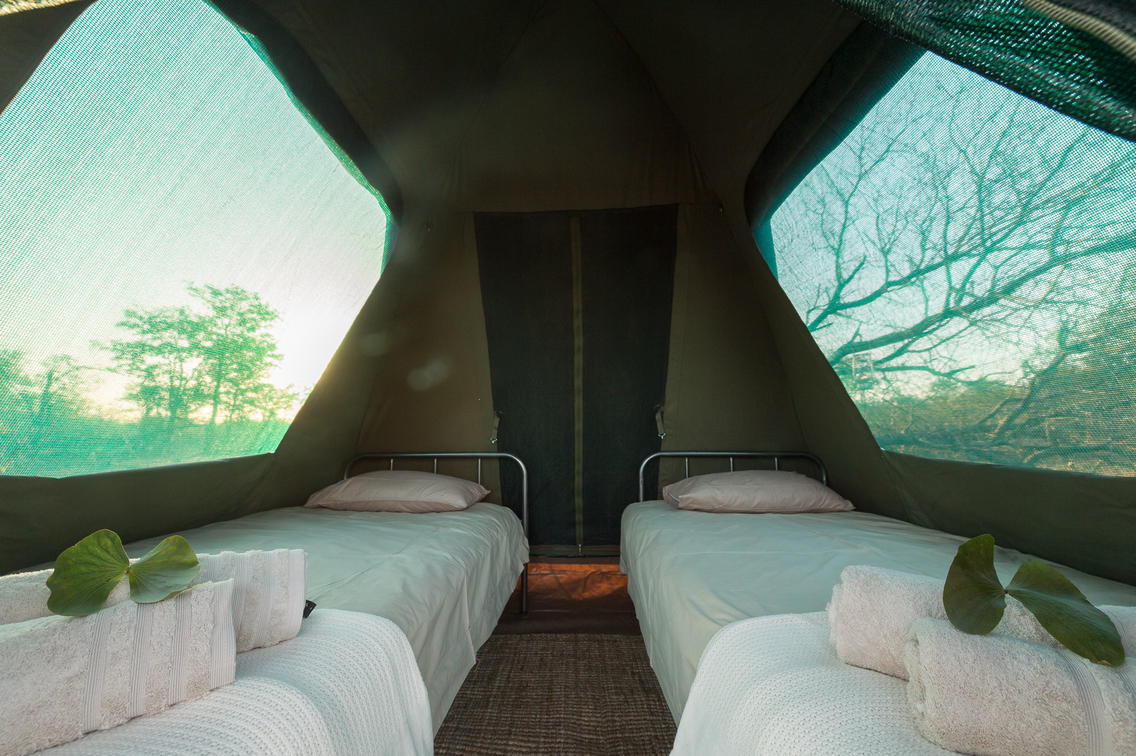 Cada tenda tem duas camas de solteiro e um zíper reverso que leva ao banheiro