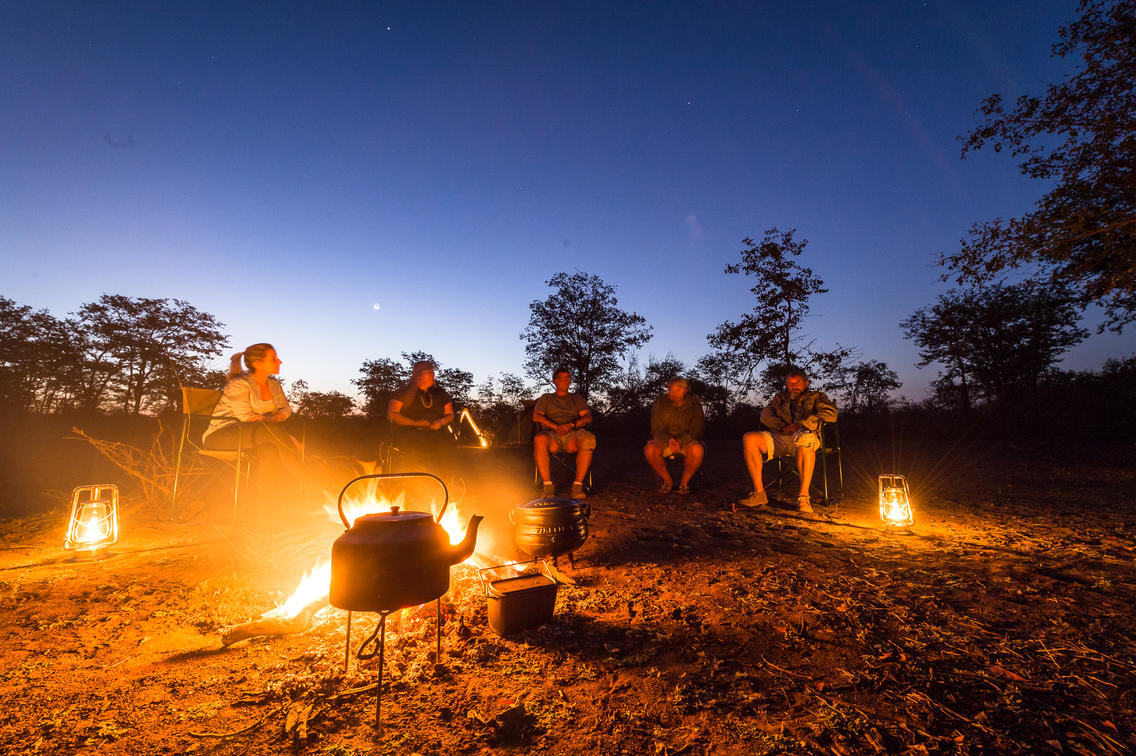 Os caminhantes relaxam ao redor da fogueira depois de um longo dia a pé