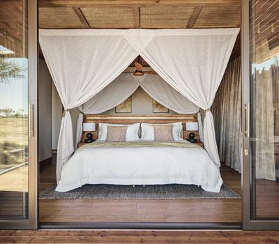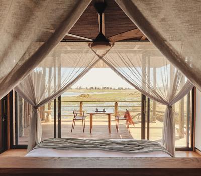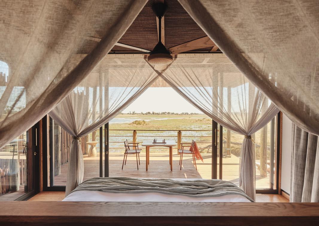 There are six suites elevated above the surrounding wetlands, with large windows and private decks framing expansive views of the Boro River and Okavango Delta. All feature an outdoor bath and shower on the deck, perfect for a dreamy soak between the shimmering waters below and the shimmering stars above.