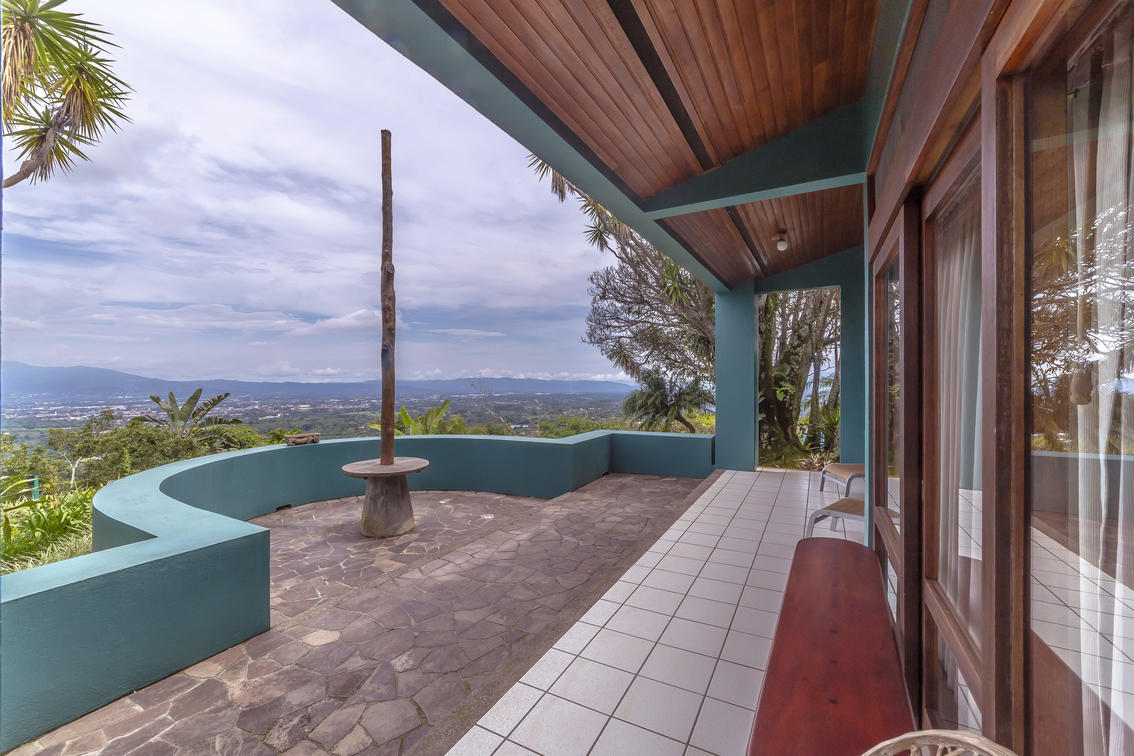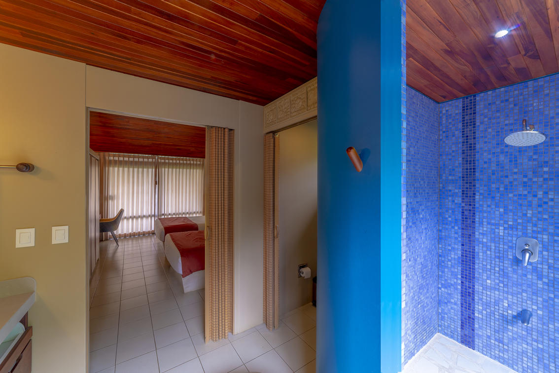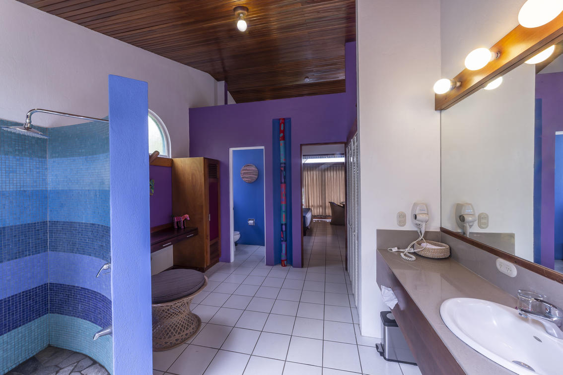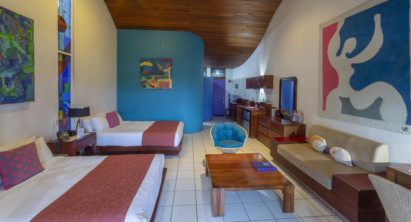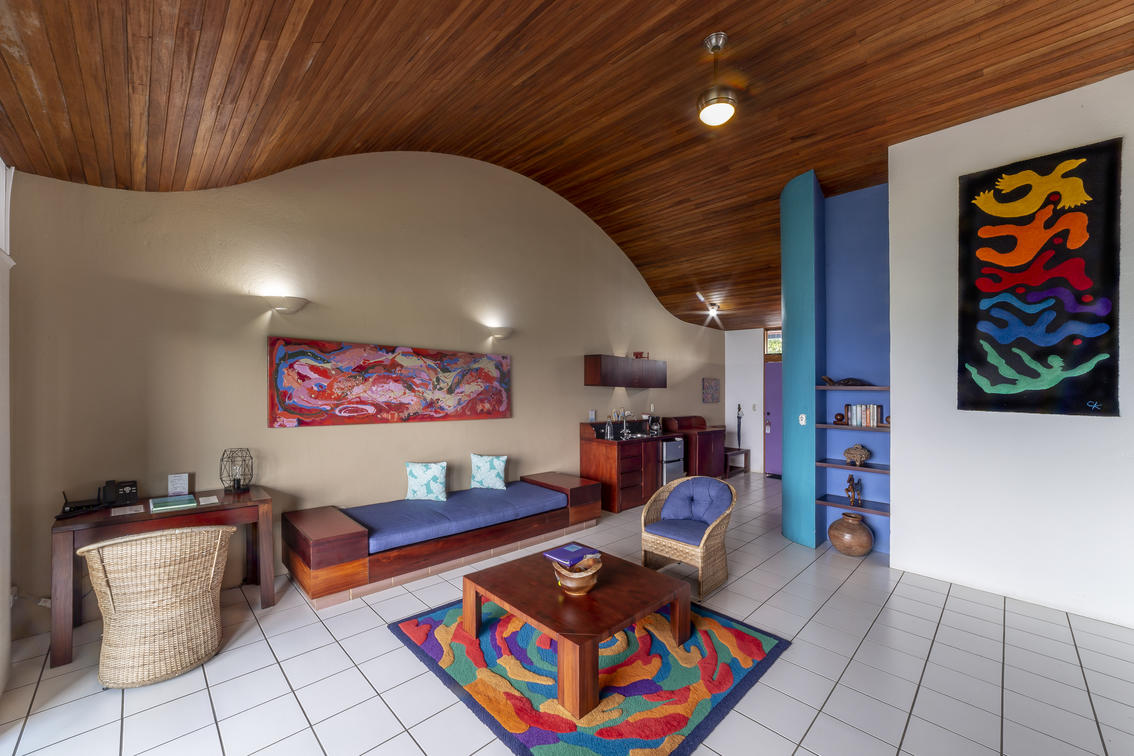Our largest and very special villa measures 1,420 sq. ft. (131.92 sq meters) with two generous bedrooms: one with a king size bed and the other one with two double beds, two bathrooms, salon and dining area, office study with internet, television, full kitchen, and a panoramic view over tropical gardens, our sunset pool, and the expanse of the Central Valley. This generous villa is ideal for special guest, visiting dignitaries or families. The villa may also be reserved for small special events or long term stays.