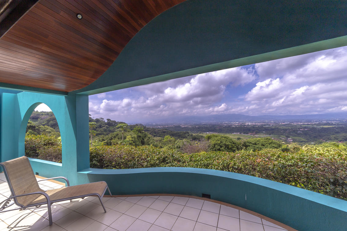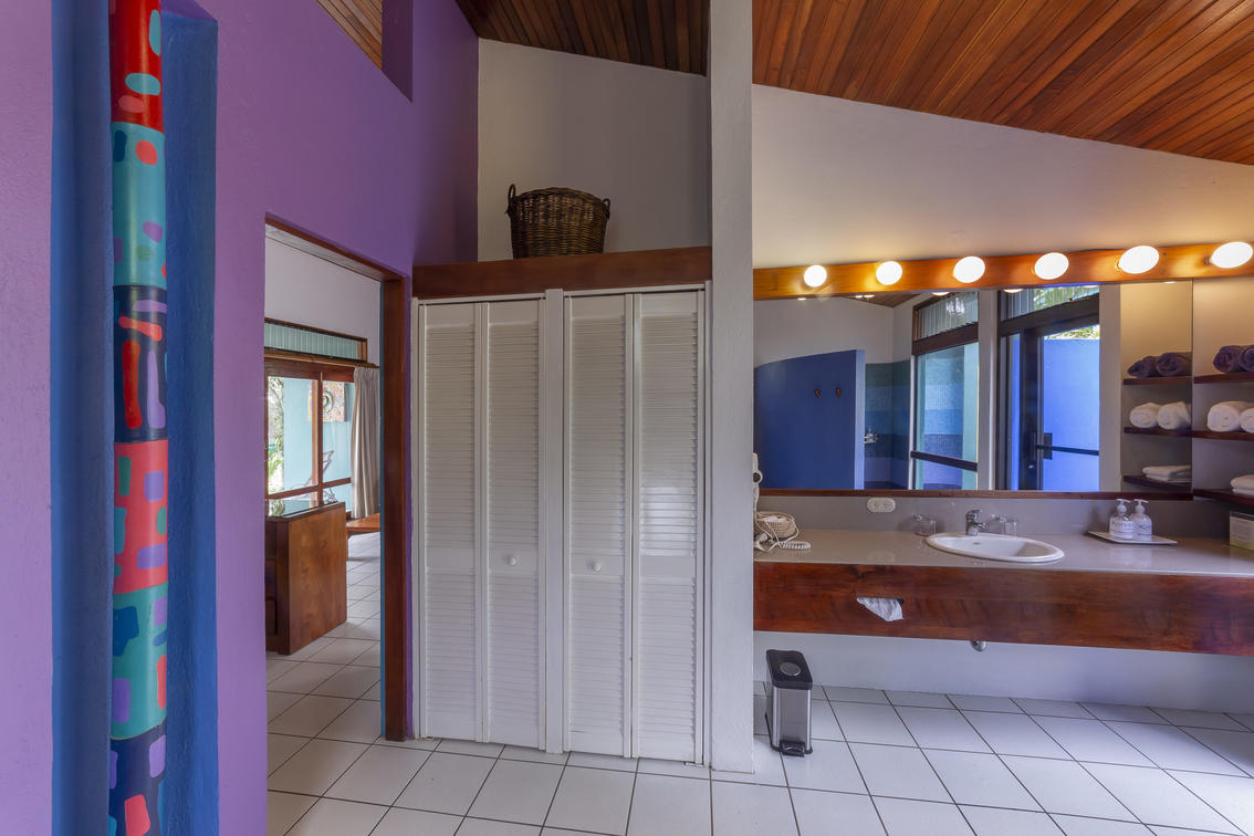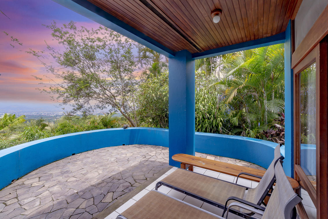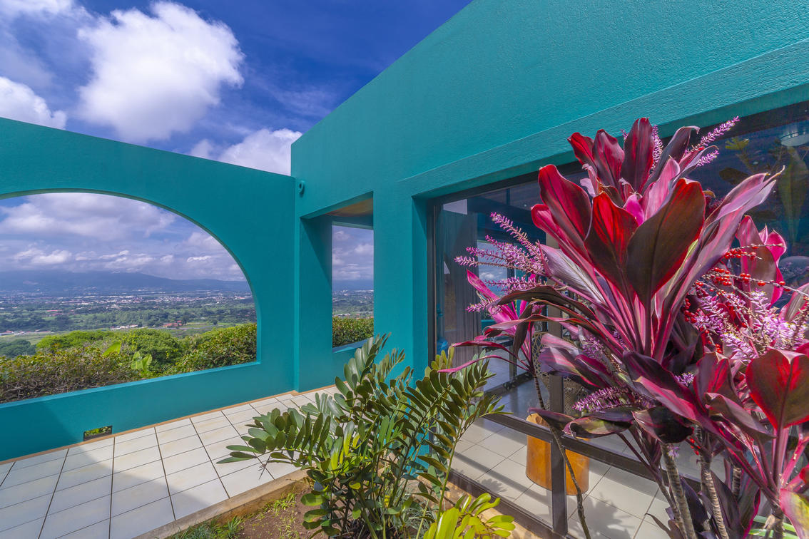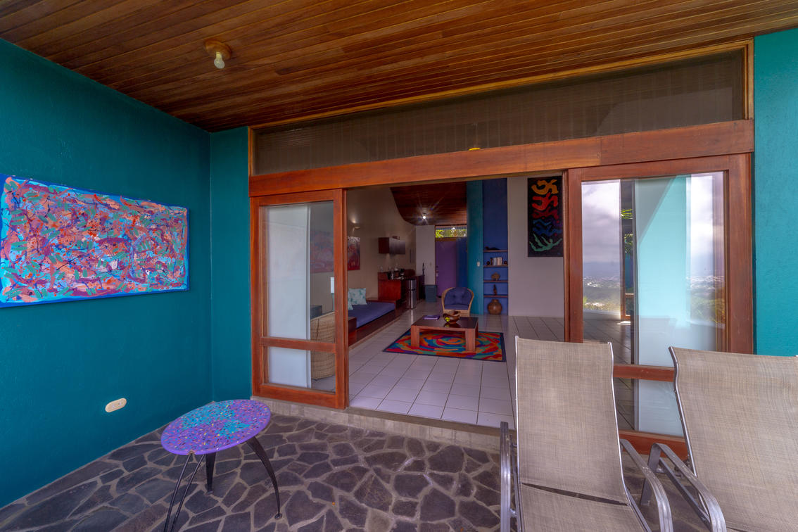 Our largest and very special villa measures 1,420 sq. ft. (131.92 sq meters) with two generous bedrooms: one with a king size bed and the other one with two double beds, two bathrooms, salon and dining area, office study with internet, television, full kitchen, and a panoramic view over tropical gardens, our sunset pool, and the expanse of the Central Valley. This generous villa is ideal for special guest, visiting dignitaries or families. The villa may also be reserved for small special events or long term stays.