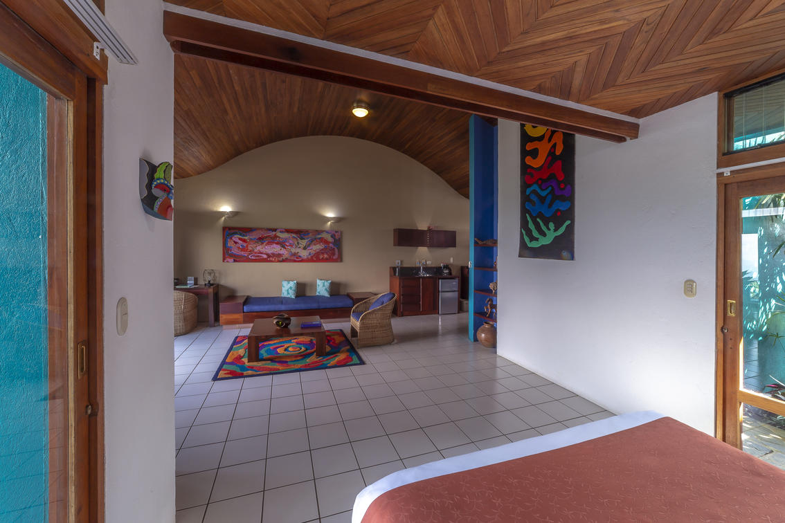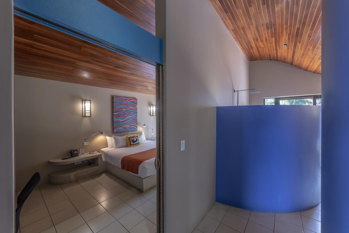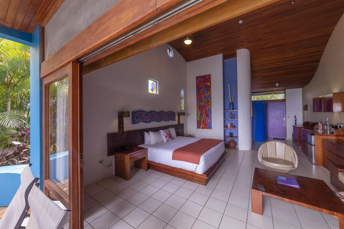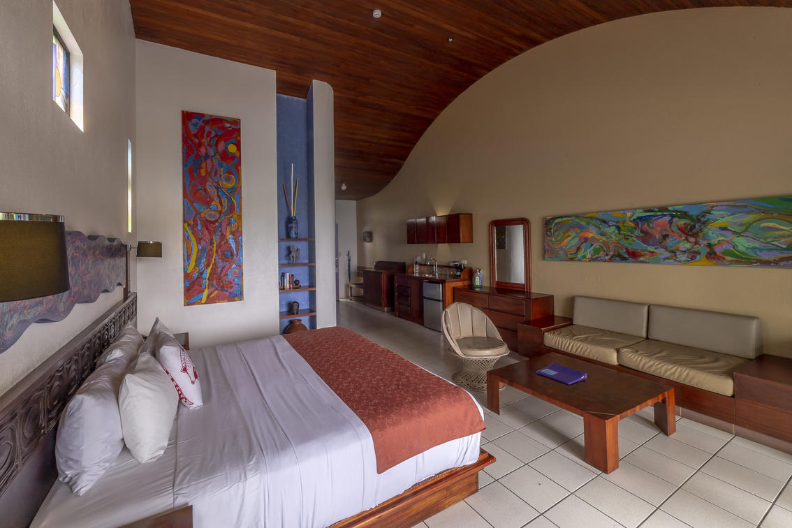 Approximately 500 sq. ft. (46.45 sq meters) in buildings of 2 or 4 villas, with either a king bed or two full beds. A round jalapa with a dramatic high palm roof, a king bed and a garden view. A favorite of bird watchers.