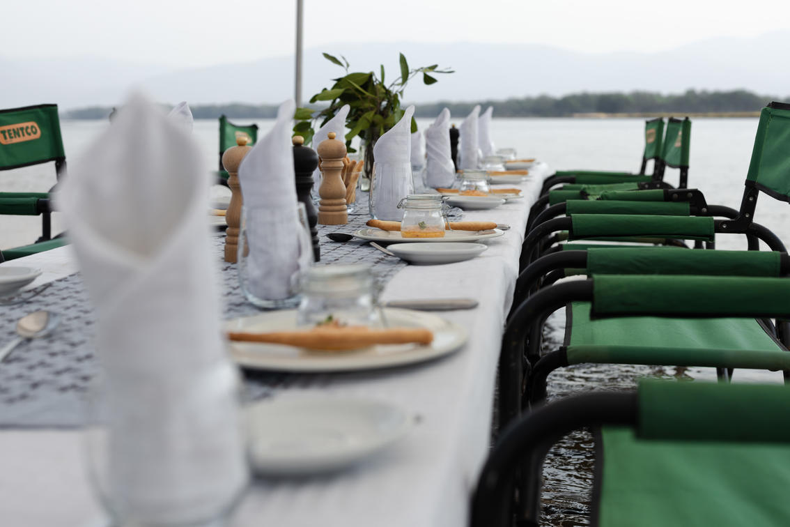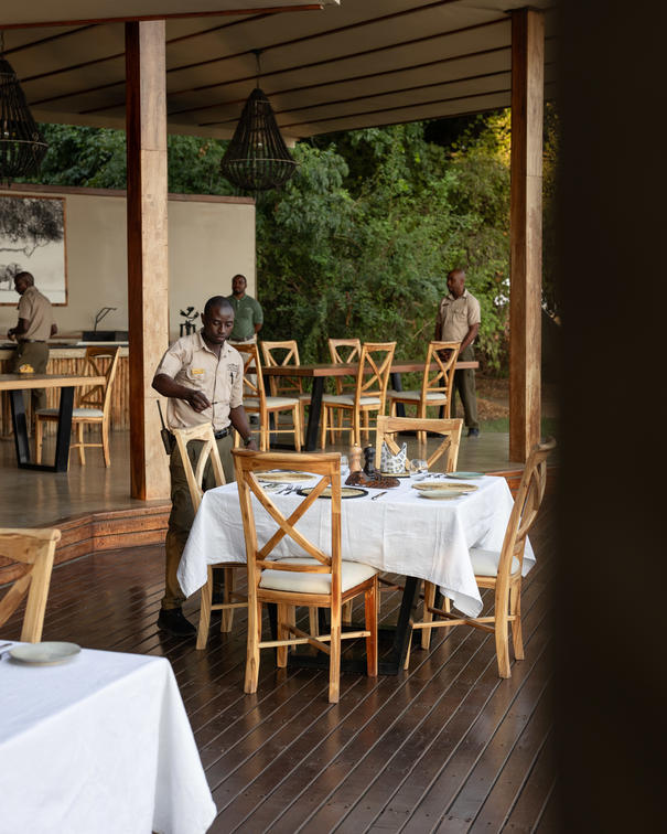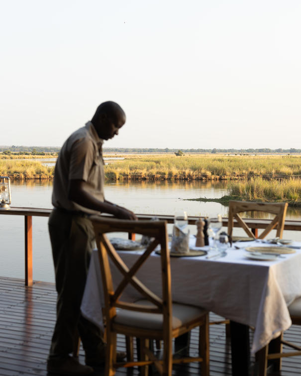 Även om middagarna inte är en formell affär består av tre rätter med fina middagar som serveras med sydafrikanska viner. Middag serveras vid vårt värdbord där du kan dela dagens äventyr eller i avskildhet i ditt eget tält som serveras av din personliga Muchinda