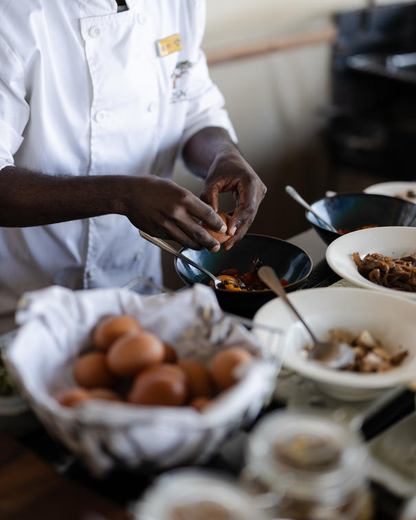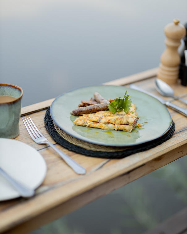 Frukosten serveras när som helst och består av nybryggt kaffe, en mängd olika te och färska juicer; rostat bröd och havregryn tillagade på glöden från lägerelden från kvällen innan; ett dagligt urval av bakverk och muffins; kallskuret och ost; flingor, inklusive hemgjord meusli; och färska fruktsallad - ett mycket hälsosamt sätt att börja dagen. Kokt frukost finns att beställa.