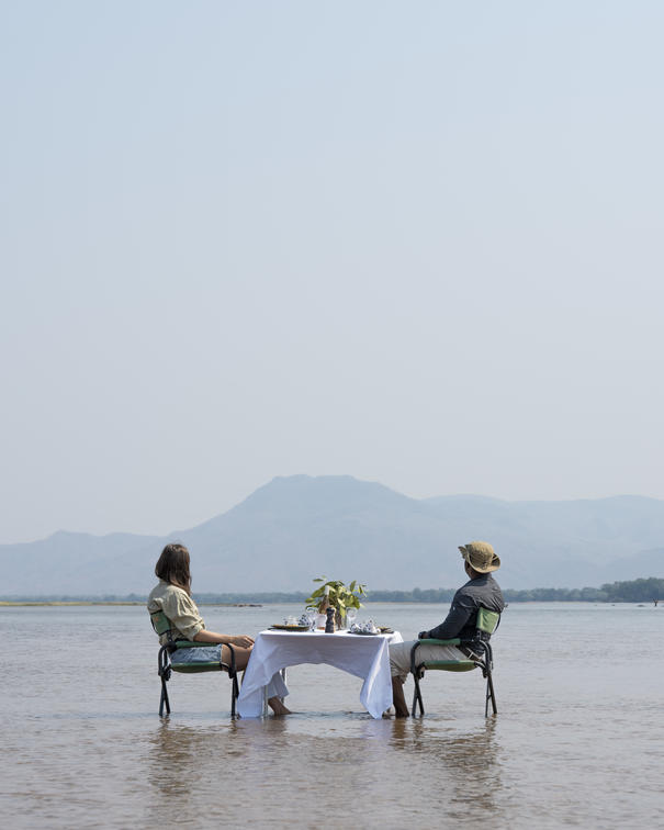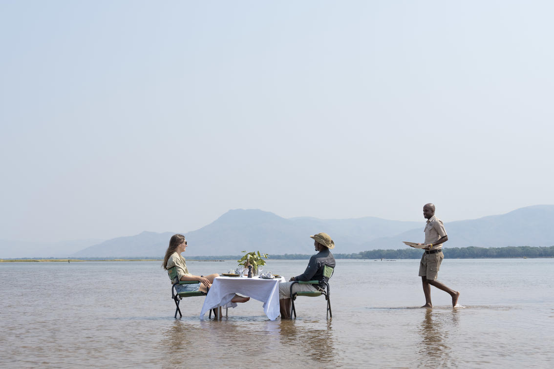 Luncher på en sandbank i Zambezifloden, vattnet som lappar vid dina fötter.