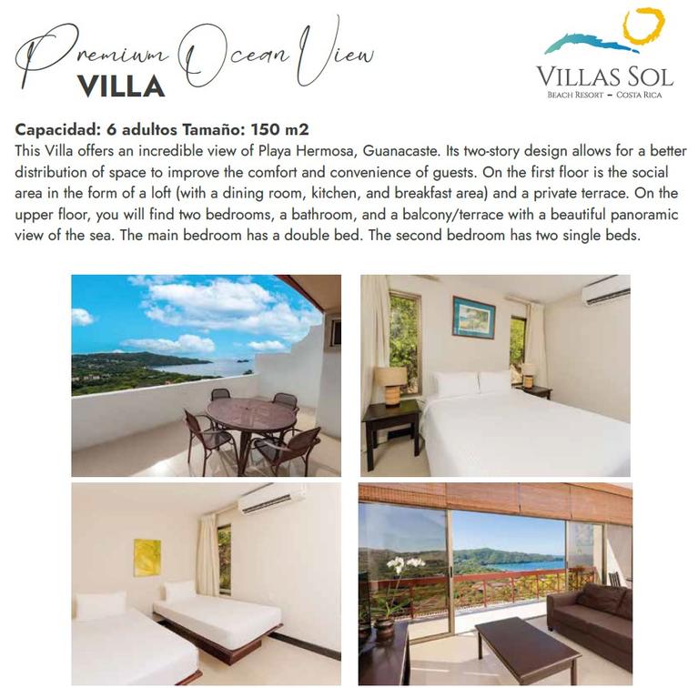 Denna villa för 6 personer har två våningar och dess design möjliggör en optimal distribution som förbinder alla sociala områden i villan. Den stora terrassen erbjuder en imponerande panoramautsikt över Playa Hermosa.