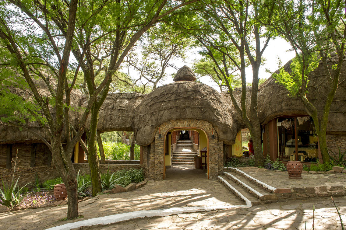 Serengeti Serena Safari Lodge entré är en stor affär, med ett högt halmtak som stöds av trädstampelare, och en traditionell väggmålning i Maasai-stil som visar en Serengeti djurlivsscen. Den varma, välkomnande atmosfären sätter tonen för safariäventyret som väntar gästerna.
