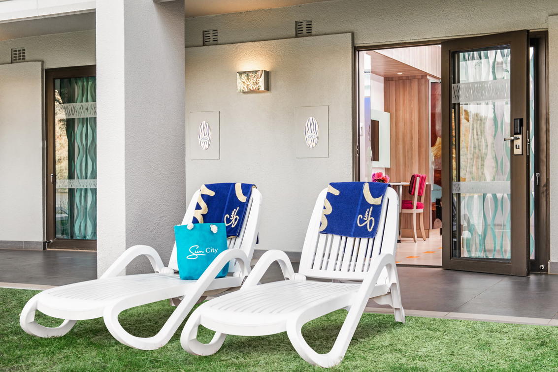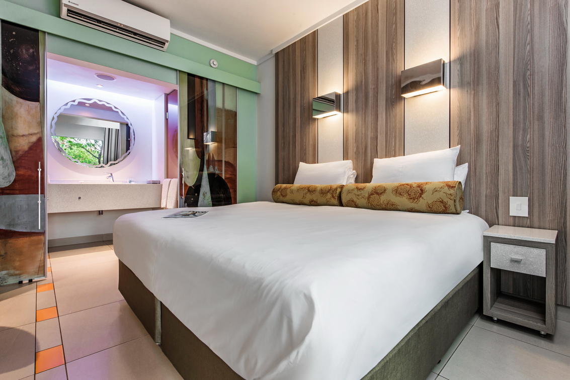 Enjoy views of the Waterworld Lake from the balcony of the upstairs Lake Family Room that sleeps 2 adults and 2 children, with twin beds and a sleeper couch. This comfortable room has air conditioning, a flat screen TV with satellite channels, a desk, tea and coffee facilities, and a mini refrigerator. There is an en-suite bathroom with shower. Rooms with double beds are available on request. Breakfast is served at The Palm Terrace Restaurant daily. Cots are available on request.