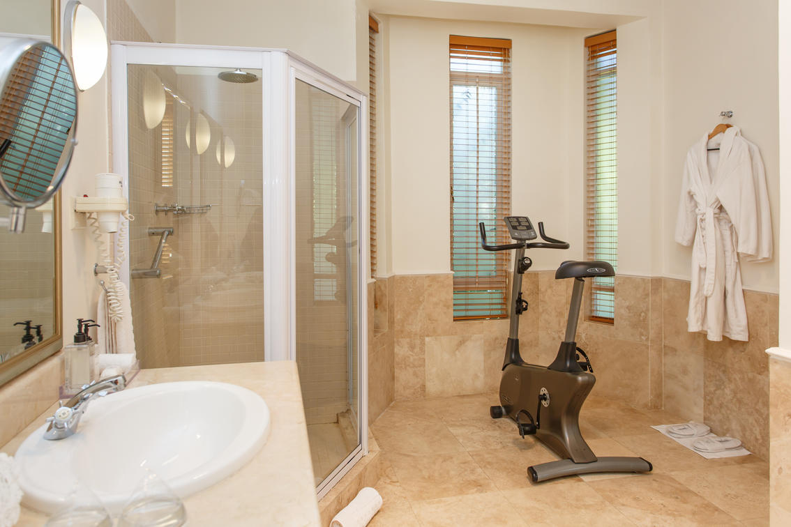 The bathrooms are equipped with separate bath and shower, private toilet, heated towel rails, double basin, hair dryers, exercise bike, bath robes and slippers.