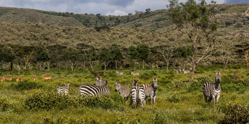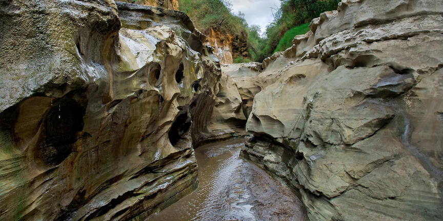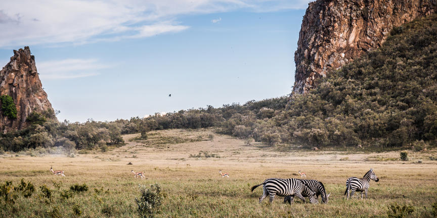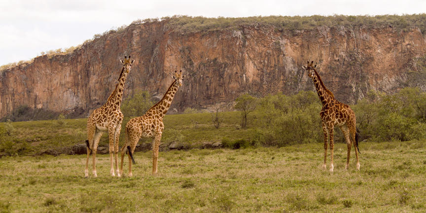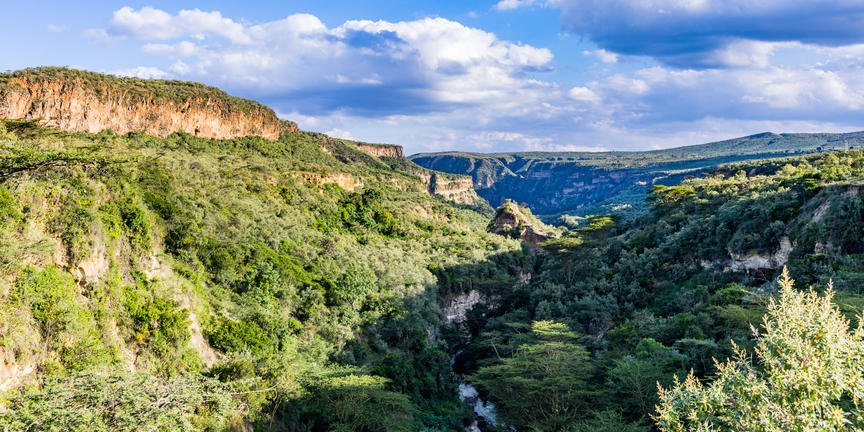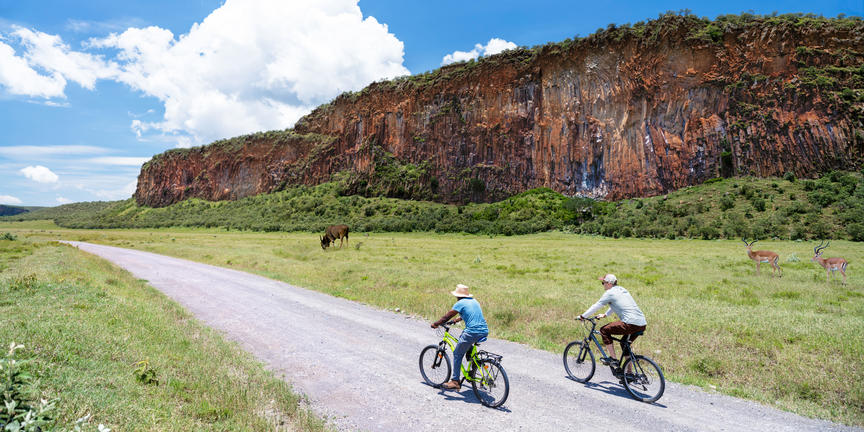 Located northwest of Nairobi, south of Lake Naivasha, Hell's Gate National Park gets its name from its pair of massive red tinged cliffs which frame its natural hot geysers. The spectacular scenery, complete with rock towers, volcanoes, and geysers with plumes of geothermal steam, is dominated by these sheer cliffs. Visitors can look forward to a wide variety of activities such as: biking through this beautiful landscape, exploring the Njorowa Gorges, discovering two extinct volcanoes – Olkaira and Hobley’s, and camping under the sparkling Kenyan night sky. Popular activities include: walking safaris, mountain biking, rock climbing, hiking and game viewing. Commonly spotted wildlife include: giraffe, zebra, eland, gazelle, buffalo, zebras, hartebeests, baboons and over 100 bird species.