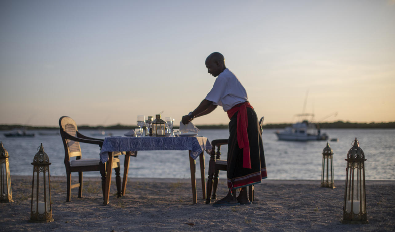 Wie überall in Kenia sind Sundowners ein wichtiger Teil des Tages. Sundowners werden von der Bar an den Strand gebracht und von Barmännern Saidi vor einem warm glühenden Feuer bedient.