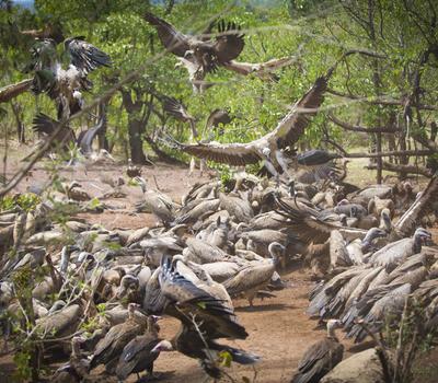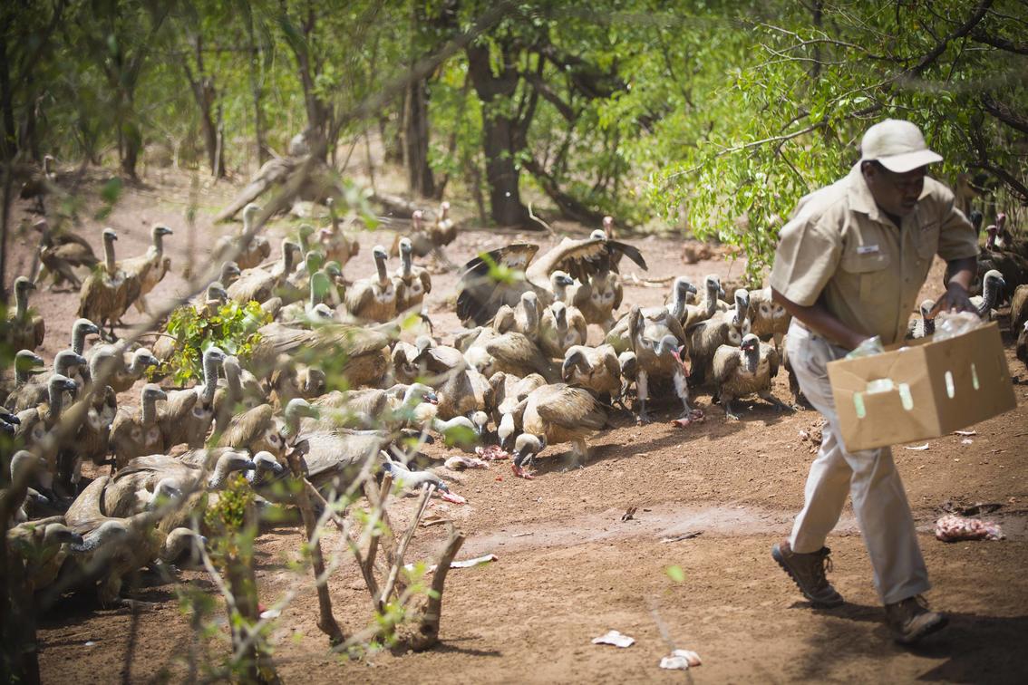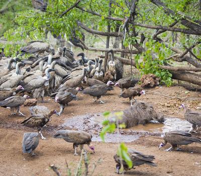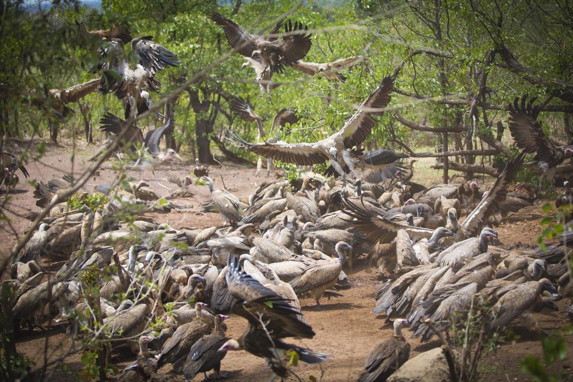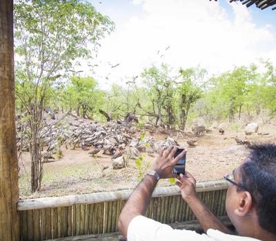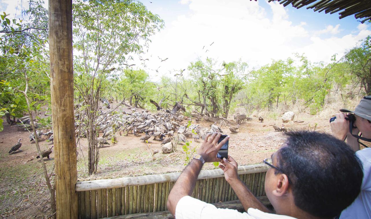 At 1245hrs, our resident guide gathers the guests sitting at the Buffalo Bar to join him to head to down to the feeding area. Carcasses from The Boma dinner the previous night are thrown out to attract circling vultures. This is an amazing experience as there is activity in the sky at 1245hrs and by 1300hrs – it is heaving with over 100 vultures and other birds of prey.