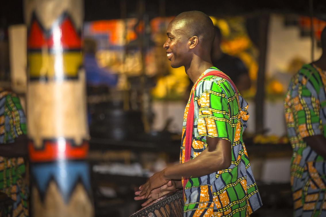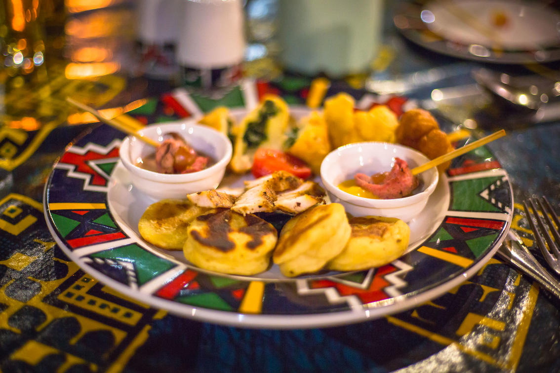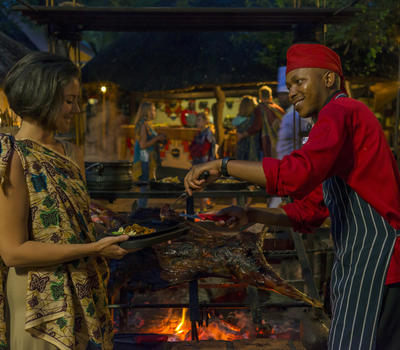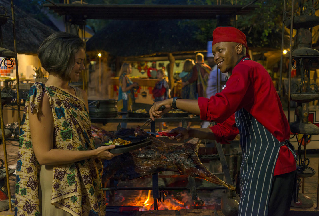 From the moment guests arrive at seven o’clock, they are immersed in the vibrant atmosphere. Tantalising aromas of local dishes and game meat on the barbeque fill the restaurant, which is partially open to the surrounding forest and the night skies. Staff members are warm and hospitable, offering traditional delicacies to guests as they enjoy the warm African evening.