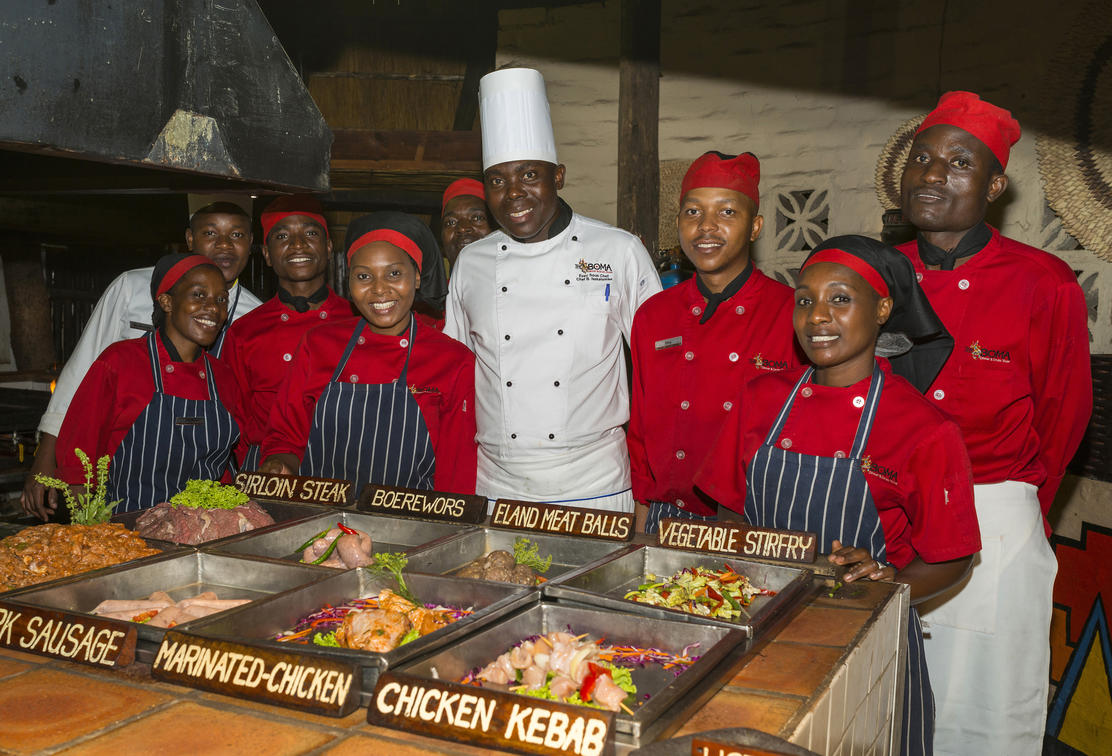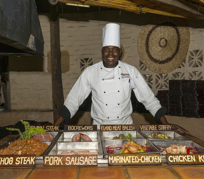 The Boma specialises in traditional African food, and the main course buffet offers mouth-watering grilled ostrich, buffalo curry, suckling pig on the spit, guinea fowl, game stew, kudu steak and even warthog fillet! There are also good vegetarian options, with bush and garden vegetables galore. There is something for everyone. If you are brave, you can try out a dried Mopane Worm on offer, and don’t forget to claim your certificate as proof.