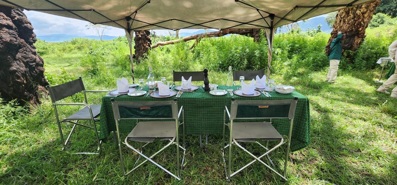 The ambiance is truly enchanting. A beautifully decorated table is elegantly placed on the floor of the Ngorongoro Crater, adorned with crisp linens and delicate tableware. As you sit, the attentive staff welcomes you with warmth and hospitality, catering to your every need.
