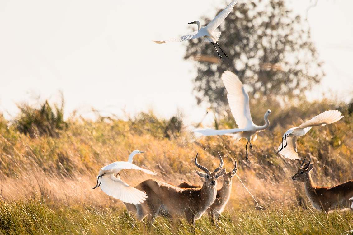 Lechwe rosso e aironi bianchi visti da un'escursione in barca.